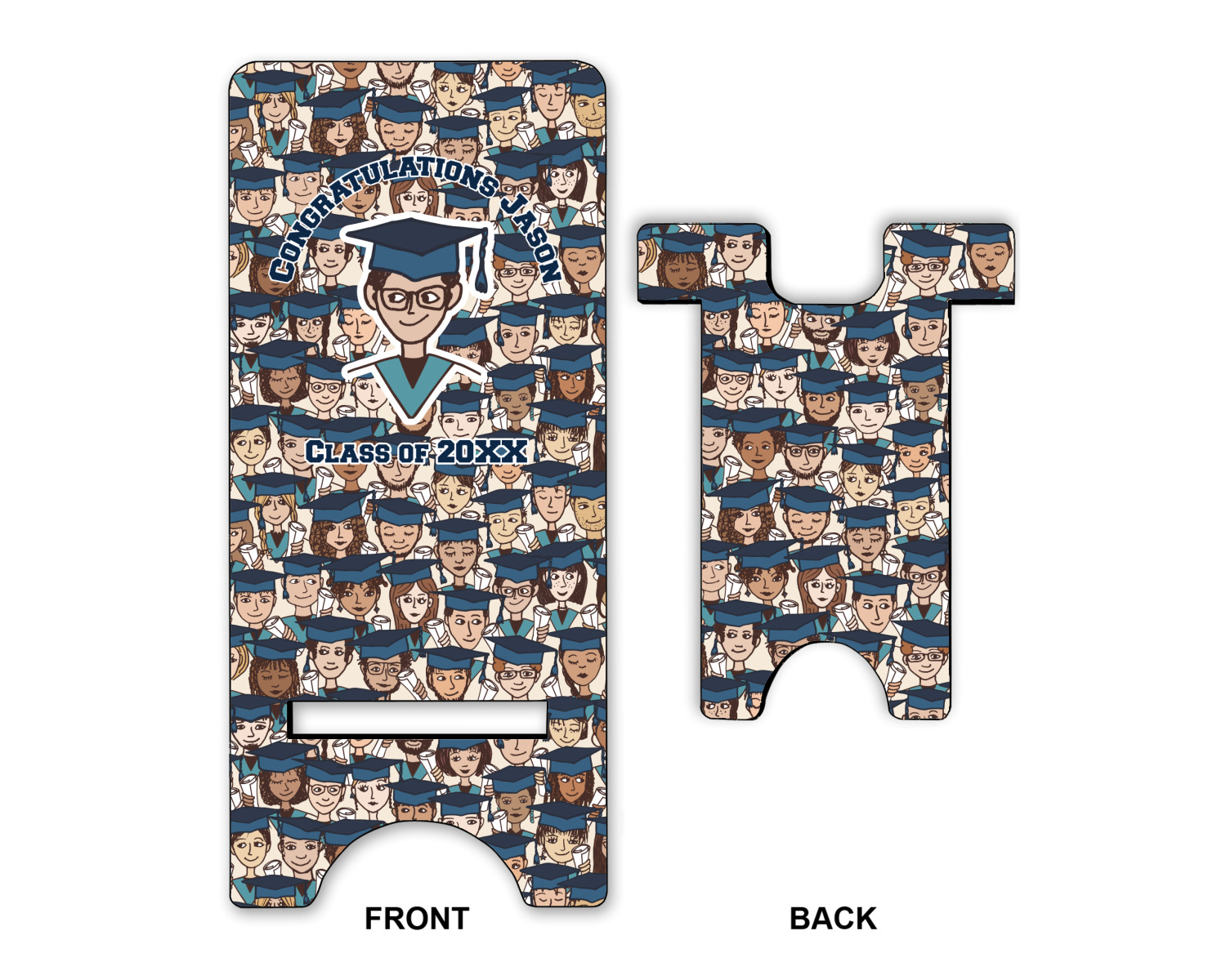For our design, we chose the layout with a single background & a graphic & text personalization style. We chose a boy graduate as our graphic and added congratulations and his class year as the personalization text. We have many of the other graduates from the background in our system, so you can select a graduate that resembles your graduate more closely. You can also customize the graduate more by changing the graduate's skin, hair & stole colors.