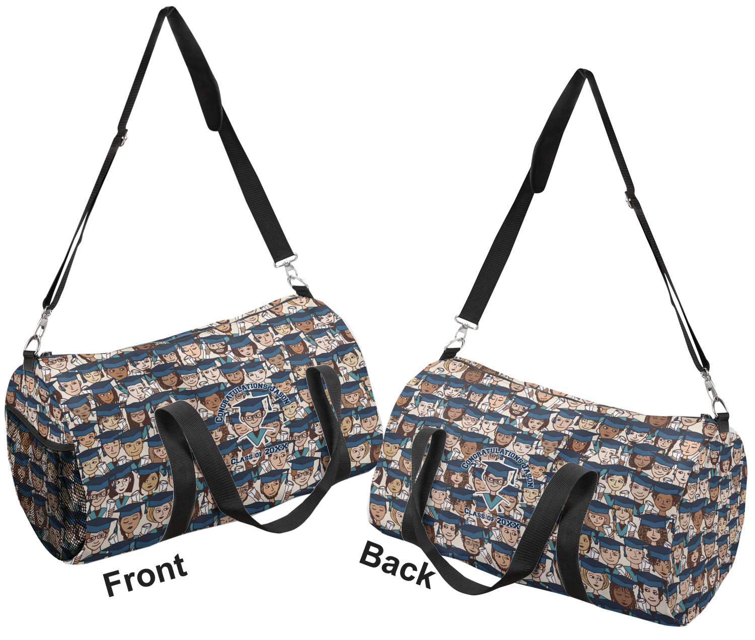 This duffle is a sturdy bag made of a canvas material. It comes in two sizes: Small (19"W x 9.5"H x 9.5"D) and Large (23"W x 12"H x 12"D). The bag is a cylindrical shape with a black adjustable strap and two handles. On one side is an elastic pouch to put a waterbottle or other small item. Your product will be sublimated with your design and is able to be designed on the front, back, and sides. Be sure to remember that the straps may cut into parts of your design if you upload your own artwork.