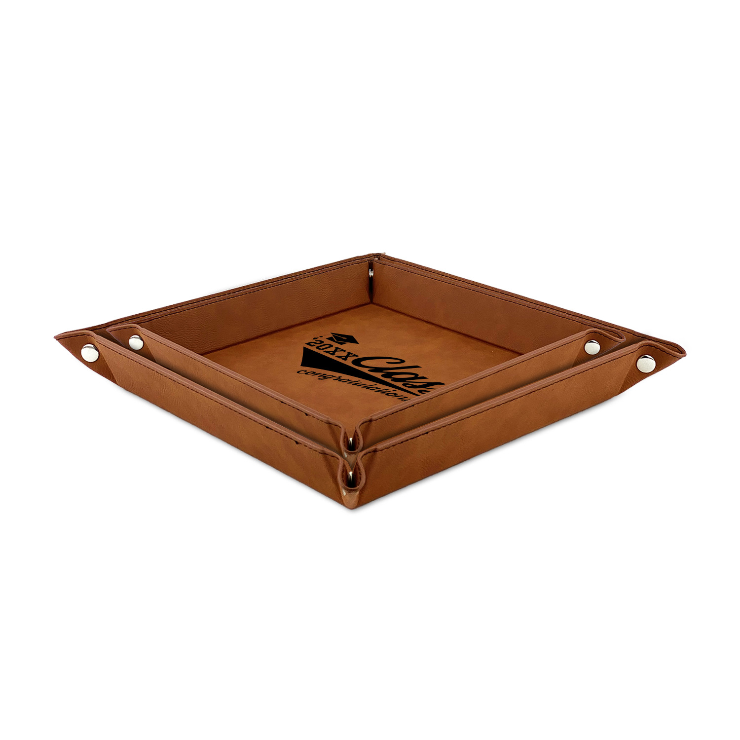 The leatherette wraps the hard board base and sides with flexible hinges to fold the sides up. The corners are secured using silver snaps. The 6in x 6 in tray measures approximately 9.5in x 9.5in when laid flat. The 9in x 9in tray measures approximately 13in x 13in when laid flat.