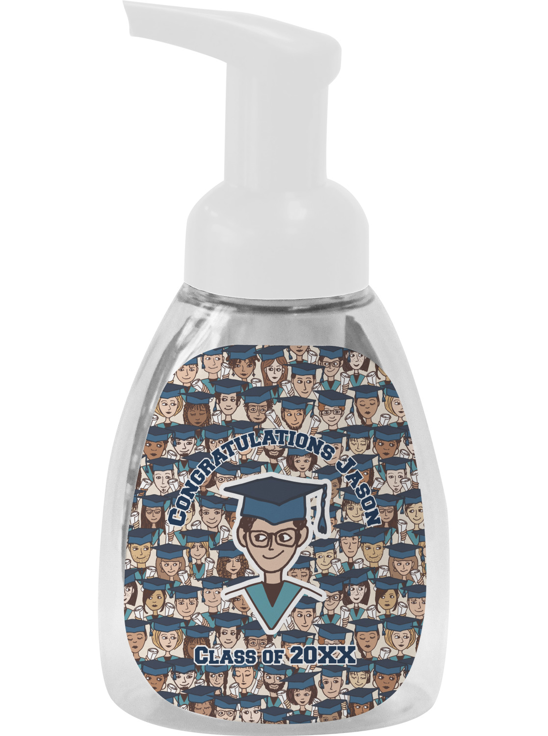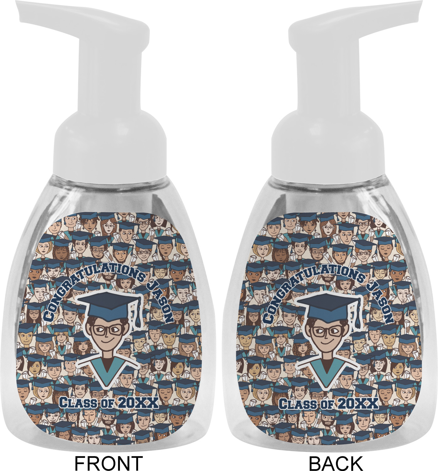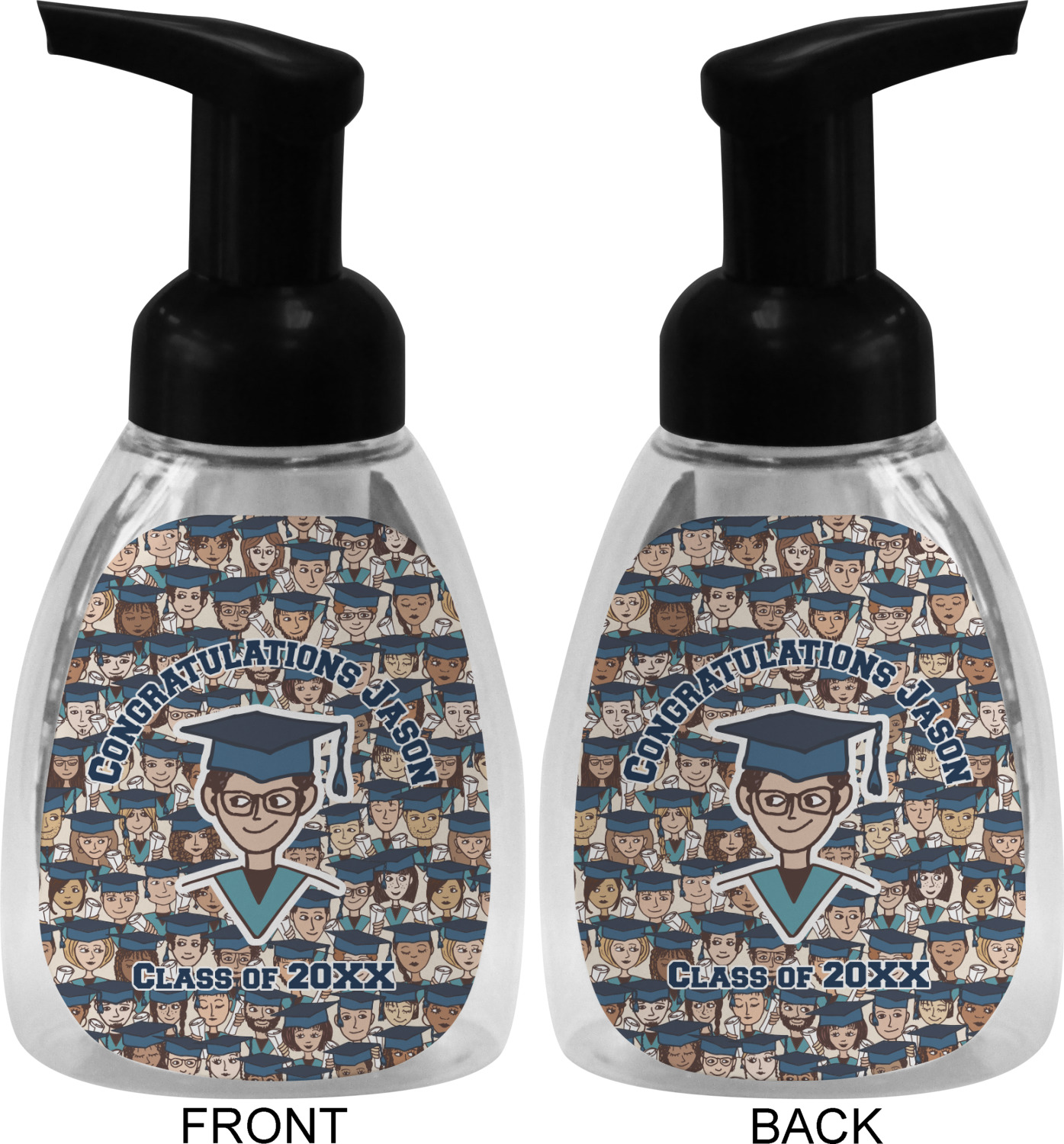 This soap dispenser is made of a robust plastic and has a clear base. The included soap pump is available in black or white color. This dispenser is 6.5 inches tall, 3 inches wide, and 2 inches deep. We display your customized designs on the front and back sides of these foaming hand soap dispensers.