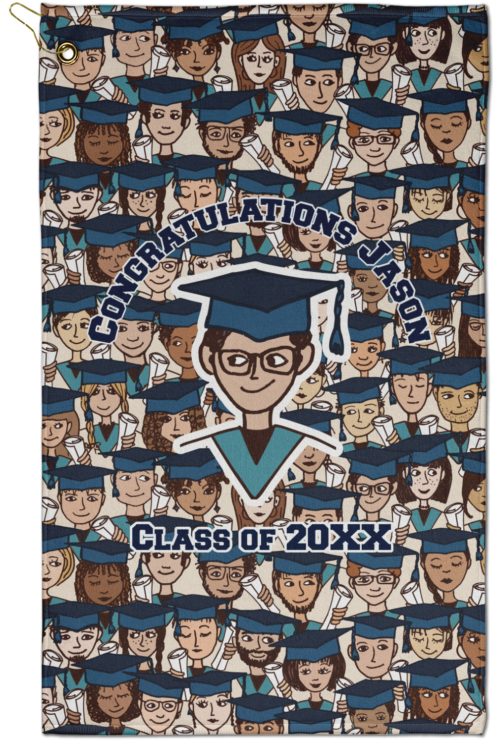 This graduation design depicts a classroom of graduating students all wearing their caps and gowns and holding a diploma in their hands. You can change the color of the mortarboard caps and the color of the stoles to suit your needs.