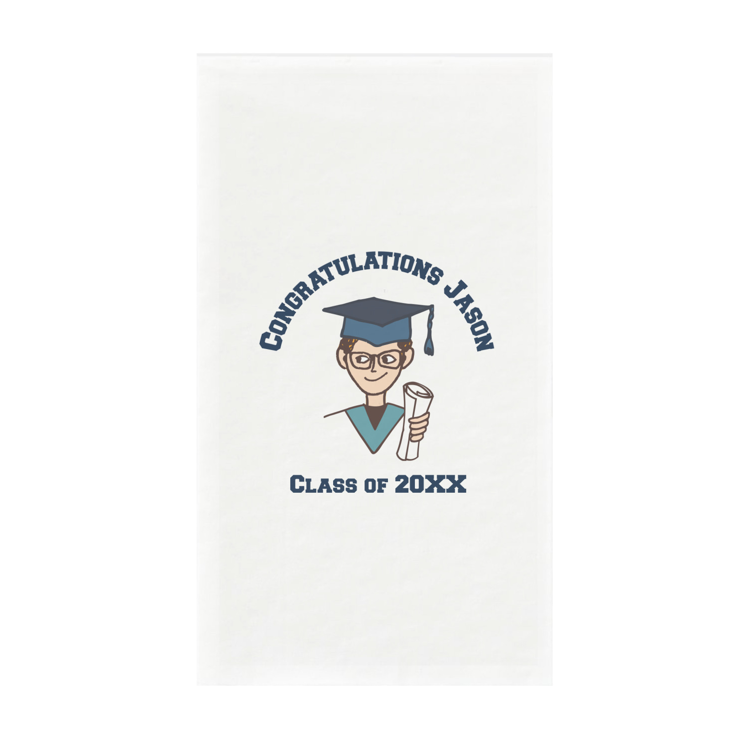 For our design, we chose the layout with a single background & a graphic & text personalization style. We chose a boy graduate as our graphic and added congratulations and his class year as the personalization text. We have many of the other graduates from the background in our system, so you can select a graduate that resembles your graduate more closely. You can also customize the graduate more by changing the graduate's skin, hair & stole colors.