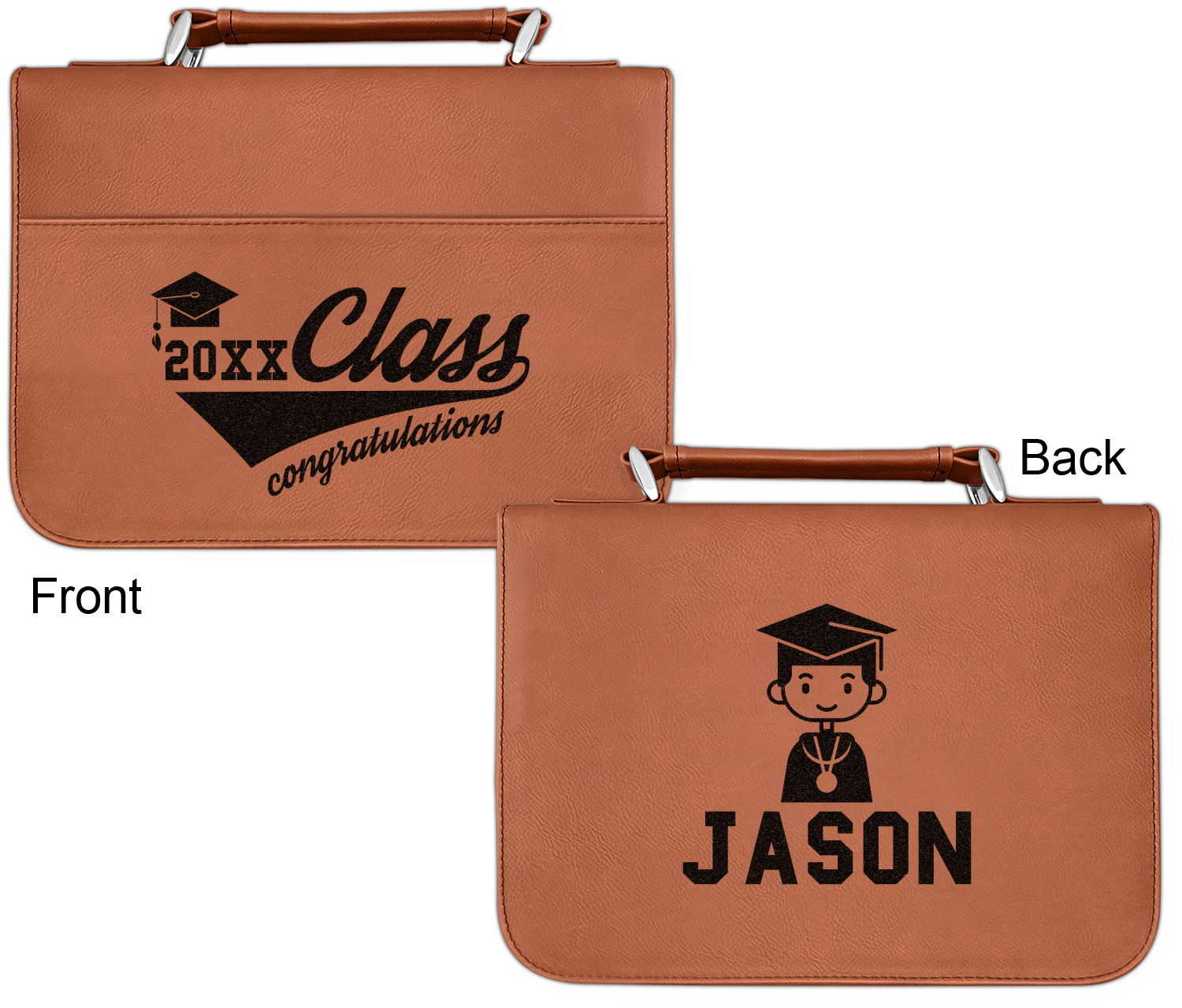 These book covers are fabricated from a fine leatherette in a warm, cognac shade of brown. A wide pocket spans across the front of the book jacket [2,400] and can store any loose papers or notes that you wish to keep. The interior of this personalized Bible cover includes slots on both sides to house the covers of your Bible, and keep it in place. The inside of the spine has a small elastic band to secure a pen. A zipper lines three sides of the cover, while the fourth side features a reinforced handle that allows for easy transport of your enclosed book.