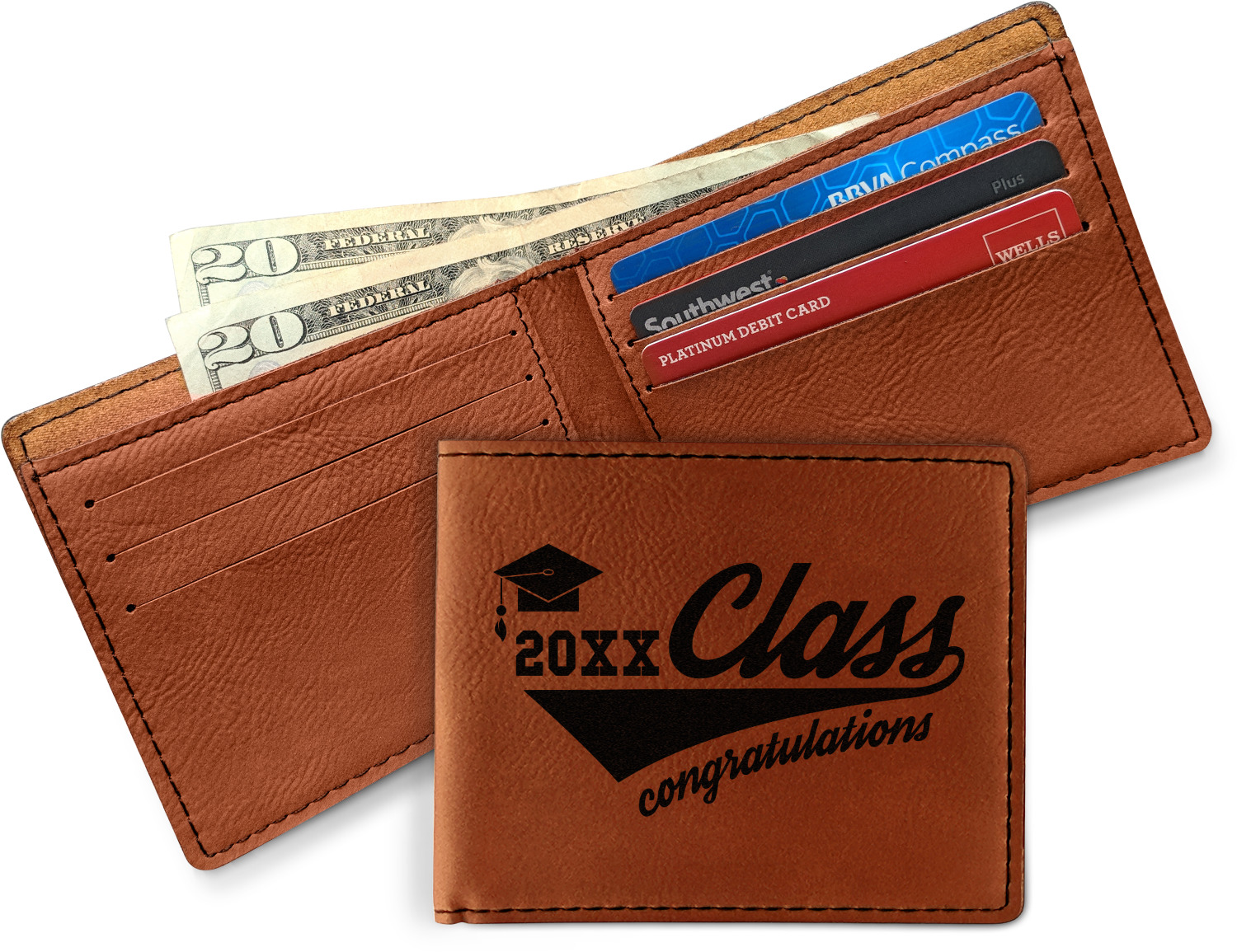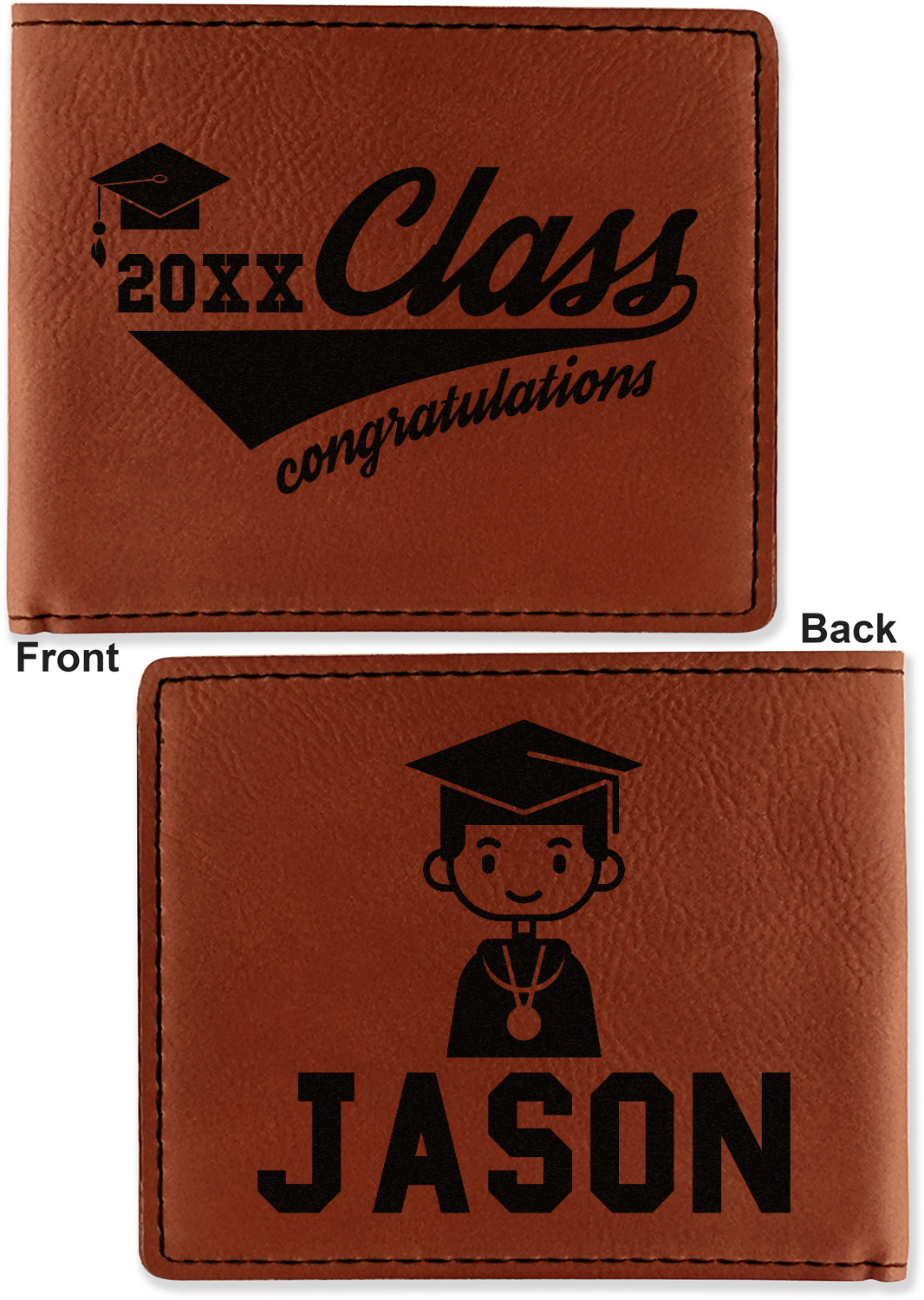 Your bifold wallet will be personalized by laser engraving, which will be a black color on the wallet. Choose a graphic, text, or monogram to personalize your wallet. There are thousands of choices in our design center.