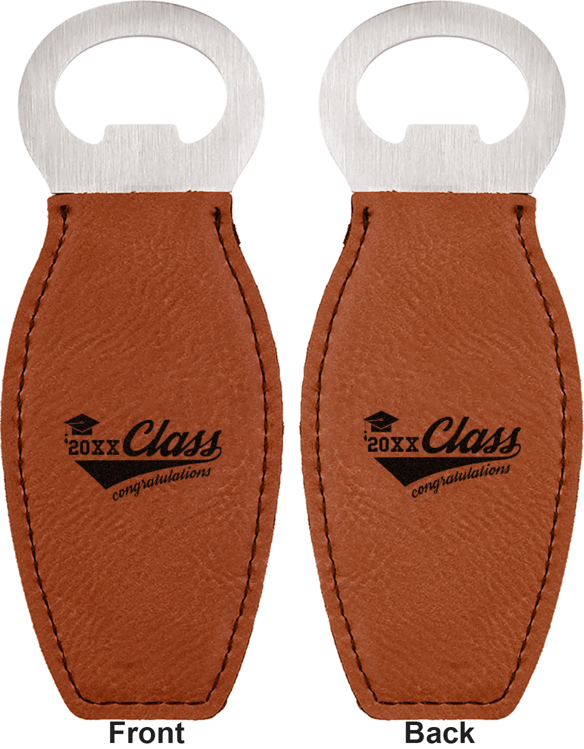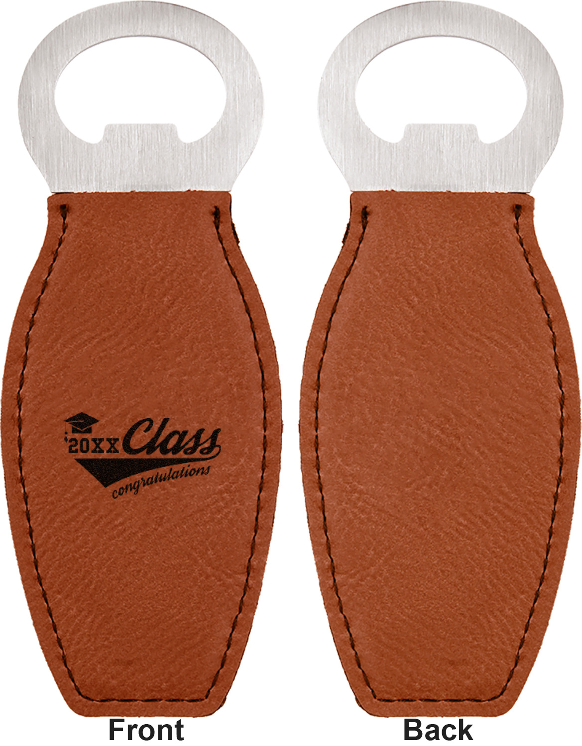 Built from stainless steel, these custom bottle openers are wrapped in a cognac-colored leatherette. Sharp, black stitching lines the edges for extra durability and a finished touch. Your personalization is laser-engraved onto the surface of this leatherette, leaving behind a crisp, black coloration. At 4.6 by 1.8 inches, this beer bottle opener gives you much of leverage when trying to open a stubborn bottle. On the opposite end of the opener, you'll find a magnet that you can use to display your new, unique bottle opener!