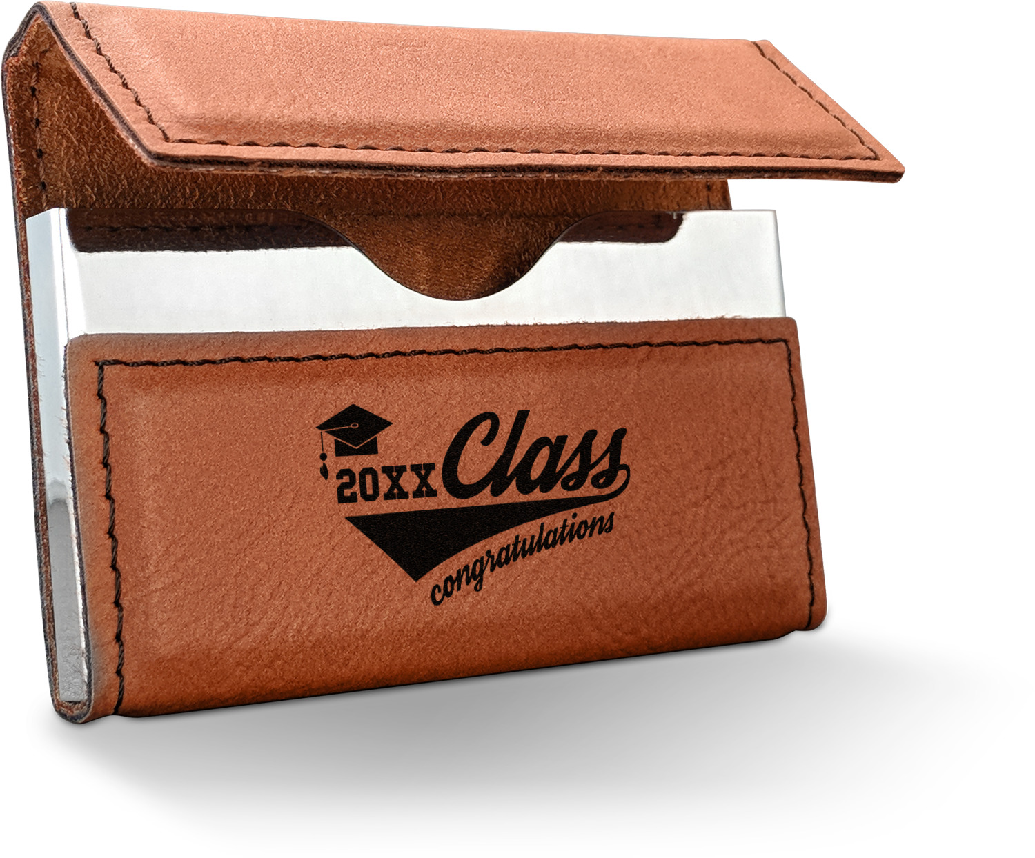 Your personalized design is laser engraved onto either the front, or the front and back of the card holder, depending on the model you purchase. Once engraved, the design will appear a darkened black against the cognac color of the leatherette.