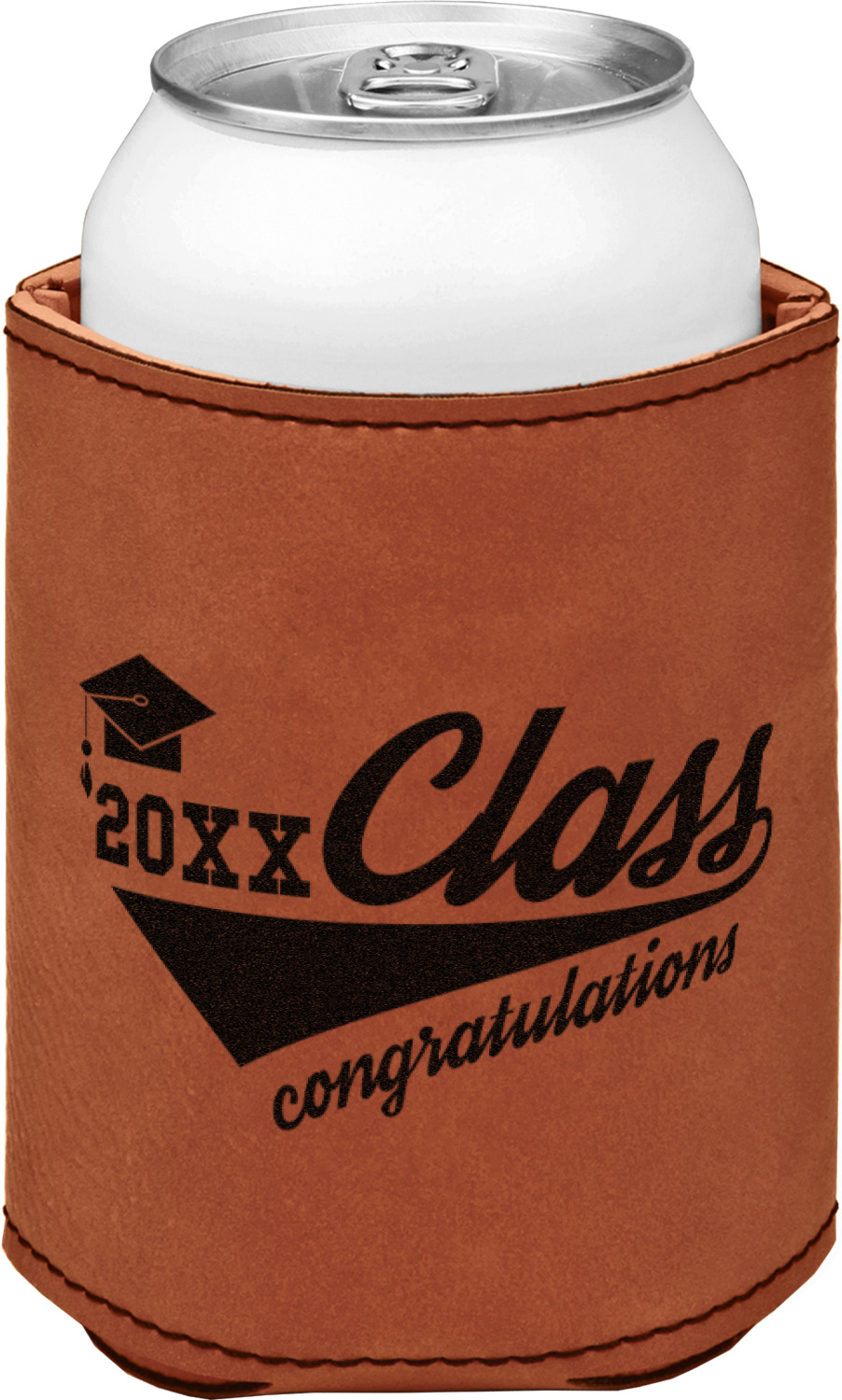 This can sleeve is made from a cognac-brown leatherette and stitched with a sturdy, black thread. A slim padding lines the inside of your can sleeve to allow for a better fit once your drink is inserted. The sleeve itself measures at 4 by 4.5 inches, allowing this custom can sleeve to accommodate most canned drinks. Your personalized design can be engraved on the front and back, or solely the front. When laser-engraved, your design appears as a black coloration which contrasts the leatherette nicely.