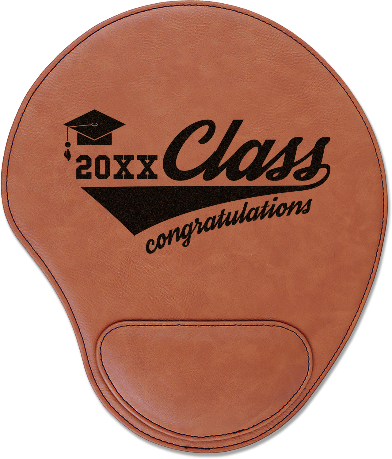 In a rounded shape, this mouse pad is made of a luxurious, cognac-colored leatherette. The nature of this material allows your mouse to glide smoothly across its surface. Strong stitching lines the edges to guarantee stability and strength. As added support for tired wrists, your personalized mouse pad features a supportive wrist rest at its bottom. This model measures at 10.25" x 9", while its wrist pad is approximately 5" x 2.75", with a thickness of 0.75". Your personalized design is laser engraved into the front face of this mouse pad.