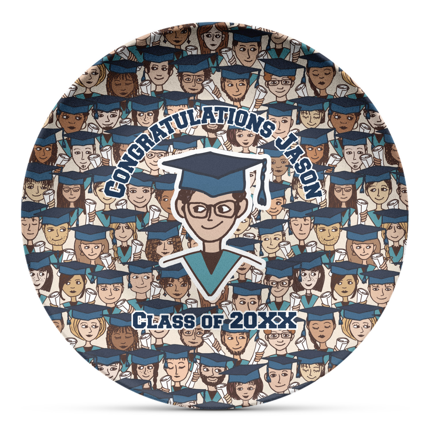 This graduation design depicts a classroom of graduating students all wearing their caps and gowns and holding a diploma in their hands. You can change the color of the mortarboard caps and the color of the stoles to suit your needs.