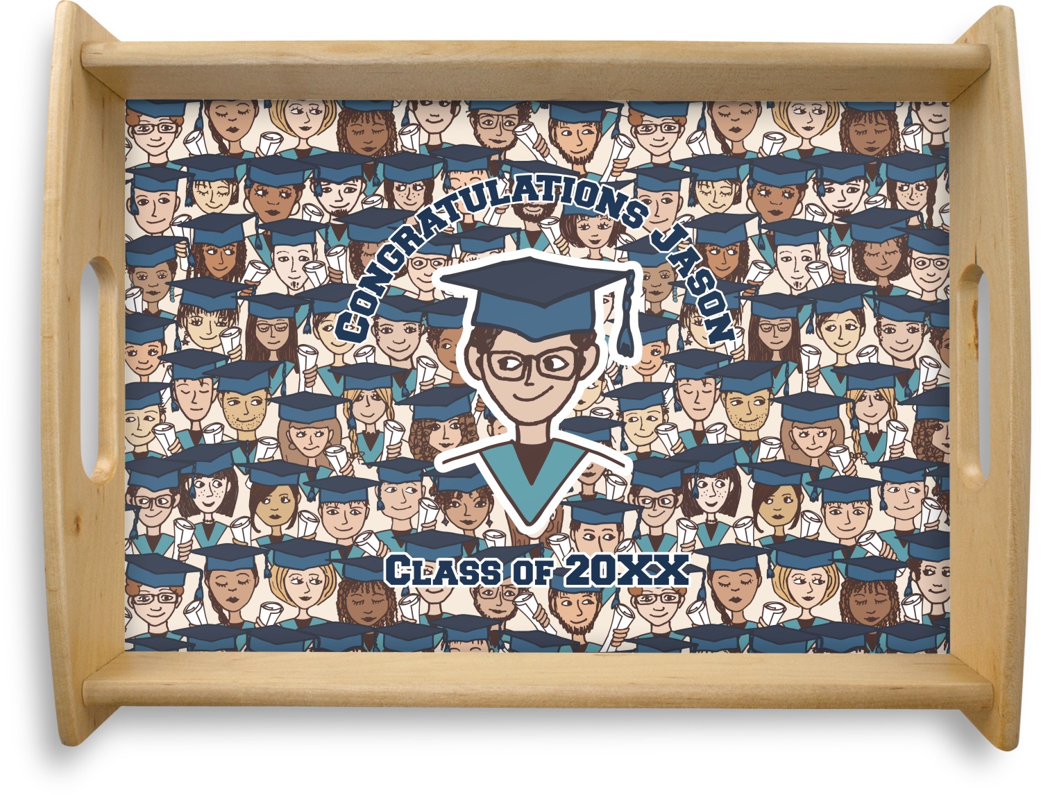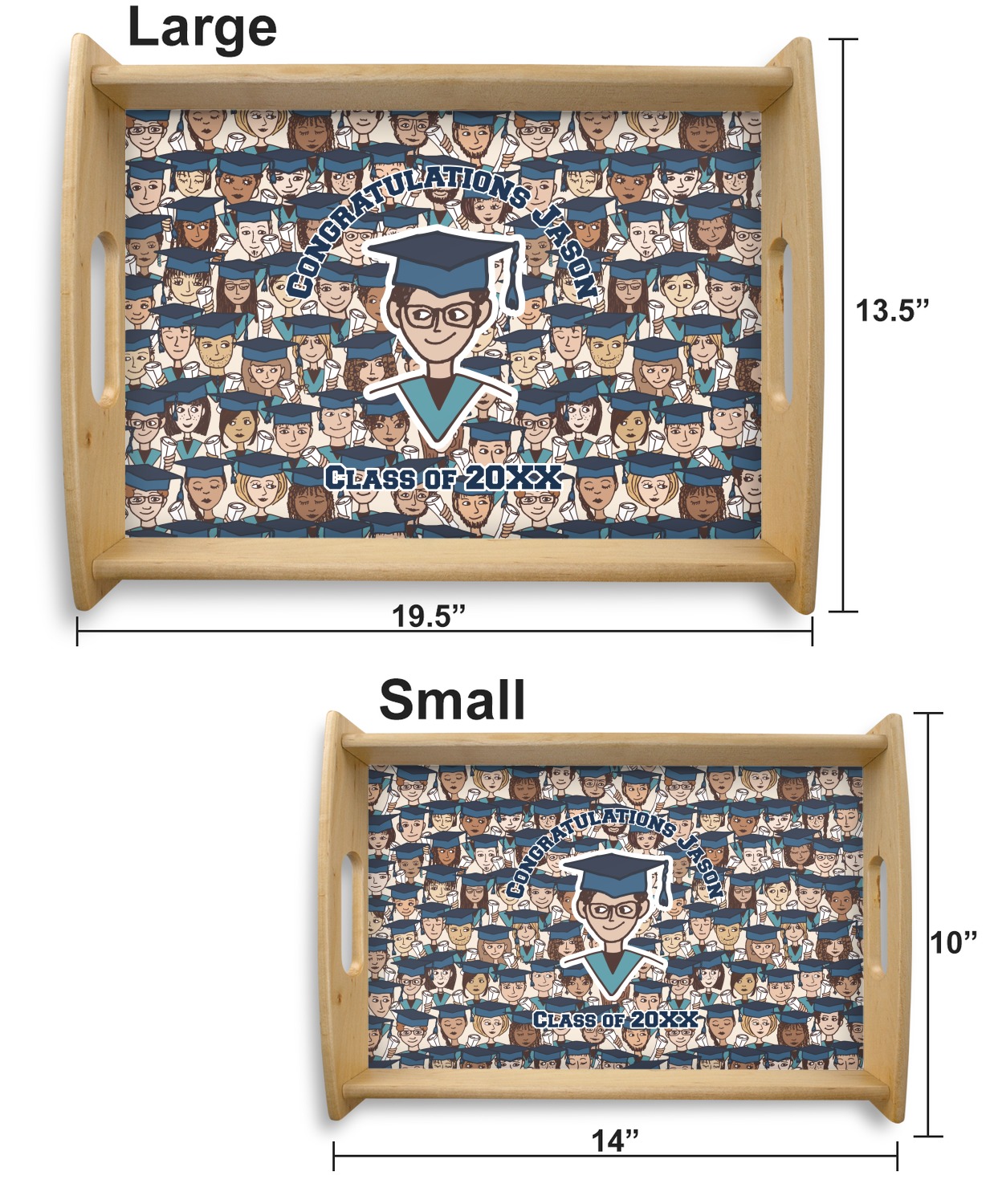 This serving tray with handles features square edges and two rounded sides, creating a very modern look. Each side is fabricated from a beautifully cut, natural wood. The bottom of the interior of the tray displays your customized design in bright, vibrant color. The tray is sold in both a black color and a natural wood look. Each variation of the wood serving tray has two sizes: Small, which is 14" x 10" x 2.25", and Large, which is 19.5" x 13.5" x 2.75".
