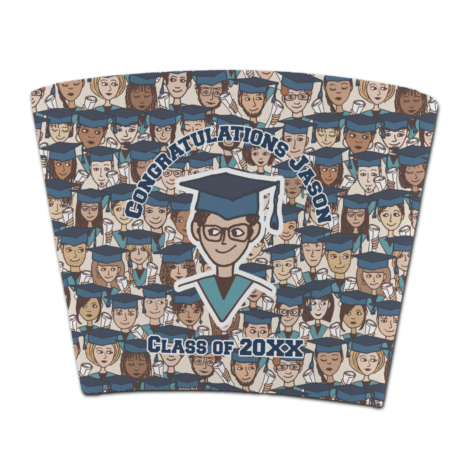 This graduation design depicts a classroom of graduating students all wearing their caps and gowns and holding a diploma in their hands. You can change the color of the mortarboard caps and the color of the stoles to suit your needs.