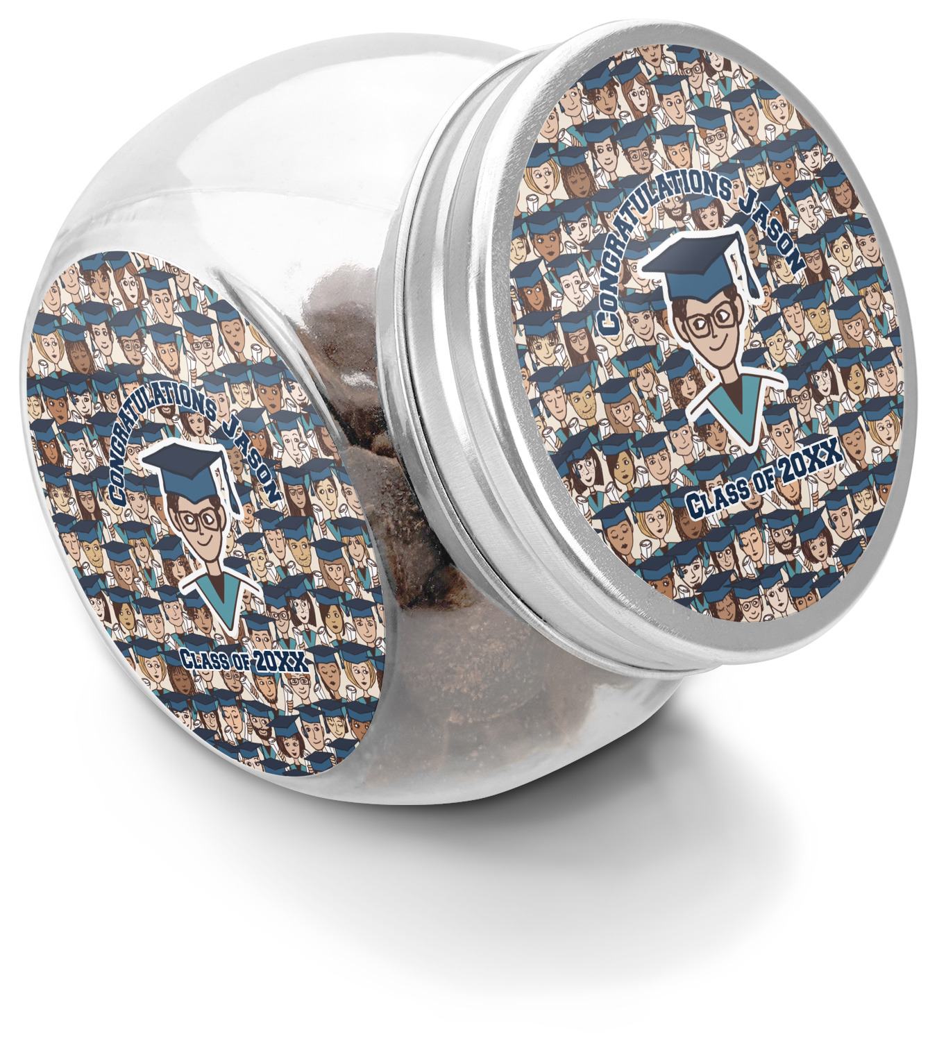 This treat jar is an excellent way to store treats for your favorite canine or feline. Moreover, their delicate, classy appearance makes them a tasteful addition to your countertop's décor. Crafted from clear glass, its unique construction and silver metal, screw-on lid allows for quick and easy access. Three, permanent, vinyl stickers are applied to both sides of the jar and lid, presenting your personalized design. The base of this glass, dog treat jar is 3.4" x 4.75", and the jar stands at 5" tall. Though on the smaller side, this jar is best suited for smaller treats or training treats.