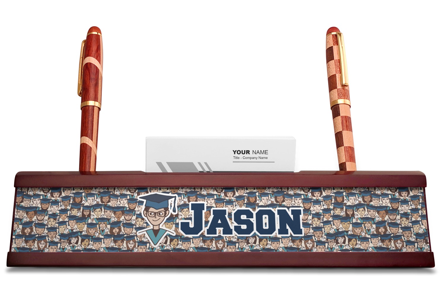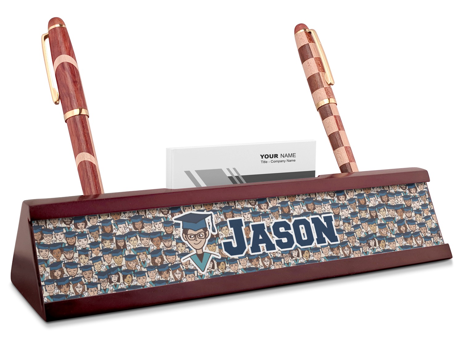 Your desk name plates are crafted from a high-quality, dark-cherry mahogany. At approximately 9.5 by 1.875 by 2.5 inches, this name plaque will fit perfectly, front and center, on your desk. Your customization spans across the entire face of the nameplate. Behind the nameplate lies a skinny slot that can fit approximately 15, traditionally-sized, business cards. You can also store your writing utensils on either side of this custom desk name plate.