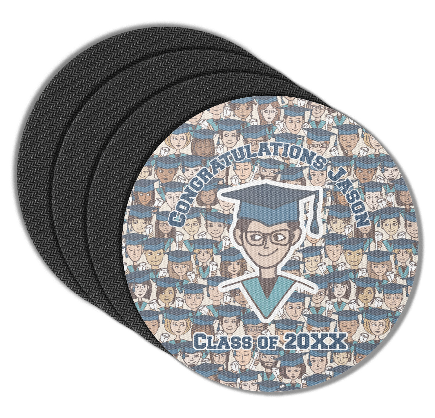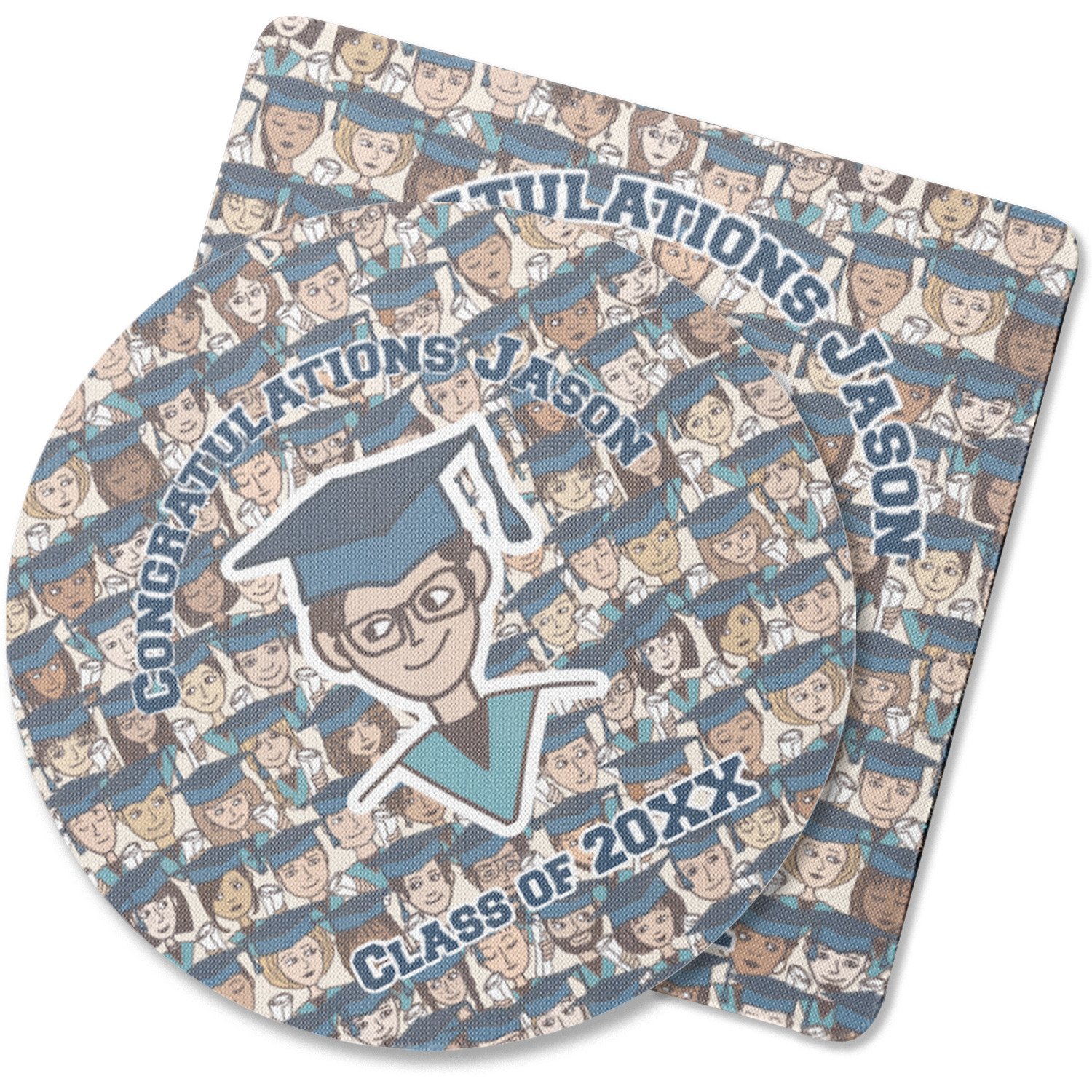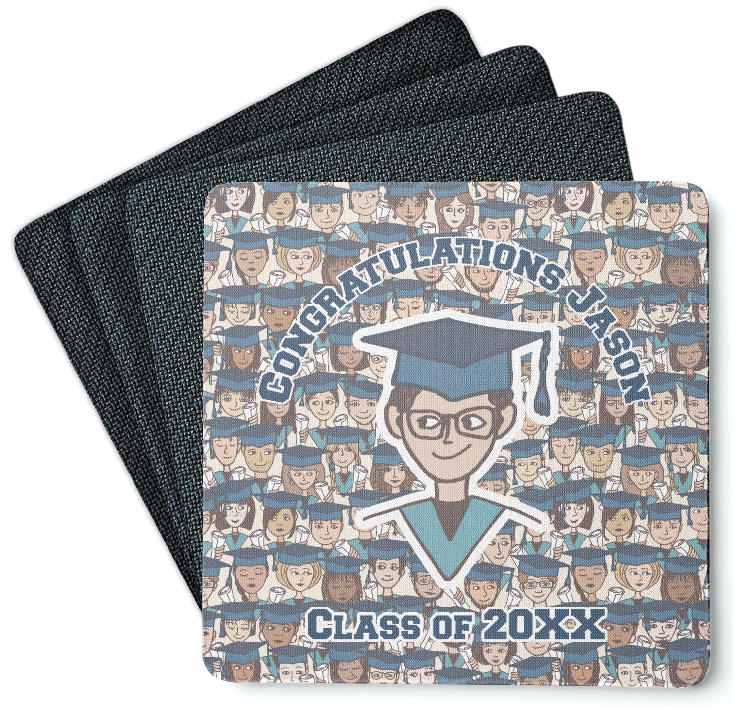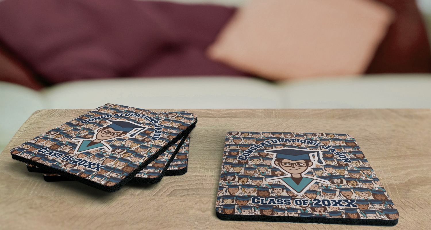 These drink coasters have a smooth, polyester top and a textured, rubber backing on its bottom. The non-slip rubber backing underneath works to keep any spills at bay. At 4 by 4 by 0.25 inches thick, these custom coasters are a suitable size for most drinkware. Your personalization is displayed atop the face of the cup coaster. We sell these rubber coasters in two different shapes: square and round. You can buy each shape as singulars or as a set of 4.