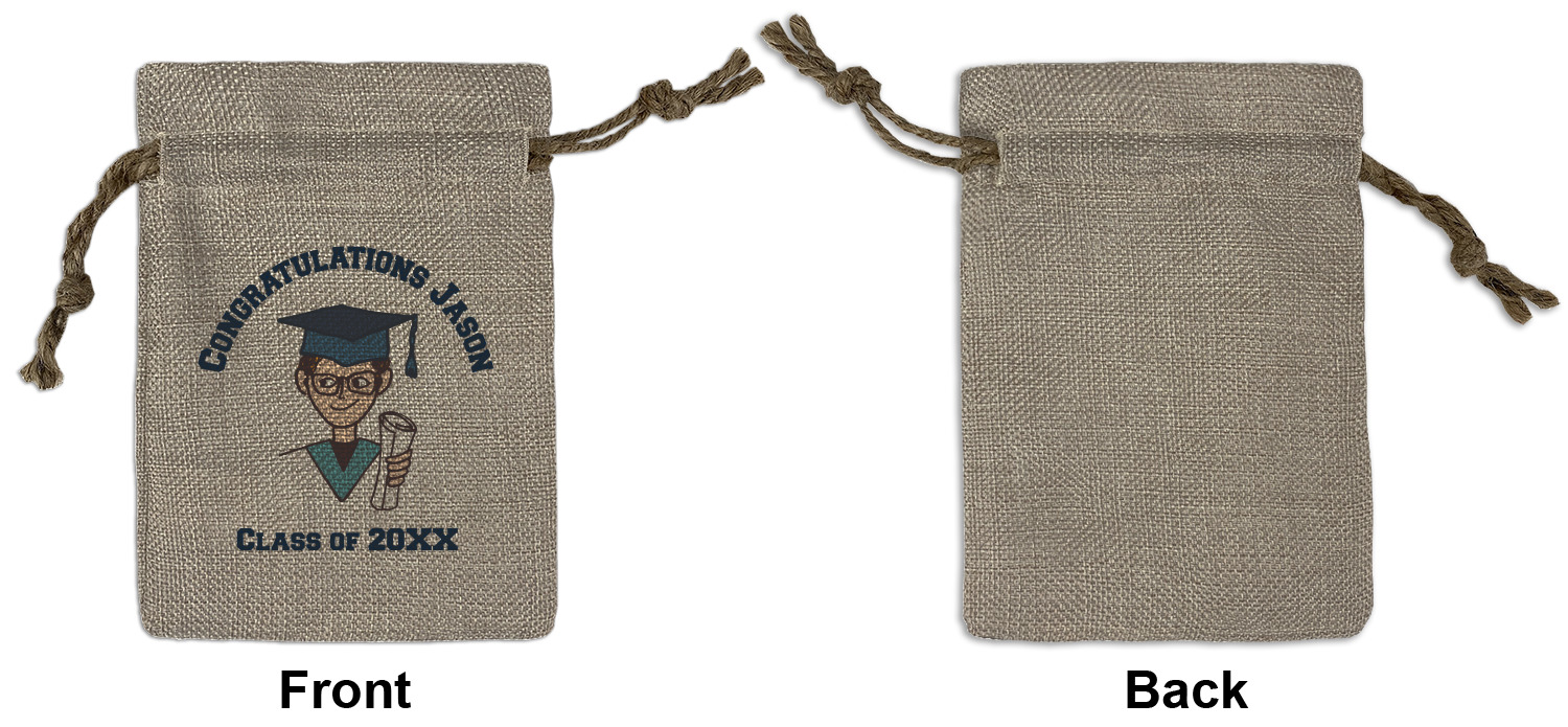 We sell our Burlap Gift Bags in 3 variant sized bags. Made with burlap polyester, each personalized bag can be secured with a twine drawstring pull. Your custom design is available to print on one side or both sides - completely up to you! The sizes of the bags measure approximately 4.5" x 6.5" for the smallest size, 6.5" x 8.0" for the medium size, and 6.5" x 13.5" for the large-sized bag.