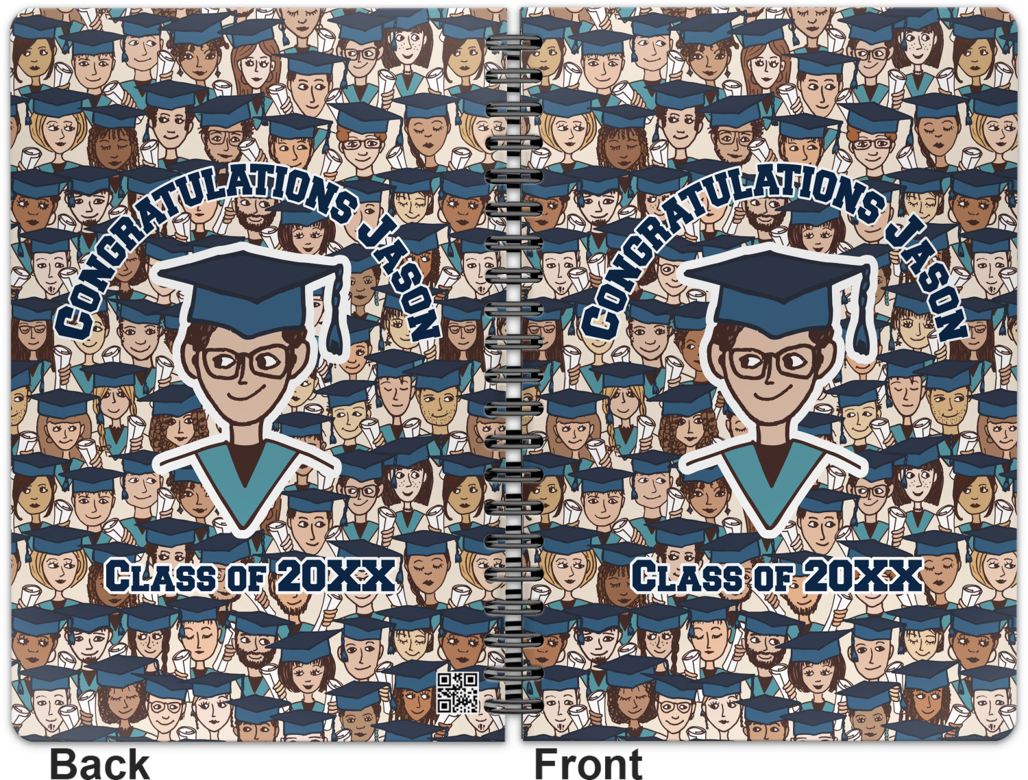 This spiral notebook includes 75 sheets of thick, ruled paper. The front and back of this custom notebook is made of a robust, laminate, plastic covering. We print your personalization on these two panels, underneath a glossy finish, which emphasizes the colors of your design. The two panels and the sheets of paper are held together by a sturdy, black coil. The paper within your bound notebook is perforated for easy, clean tearing.
