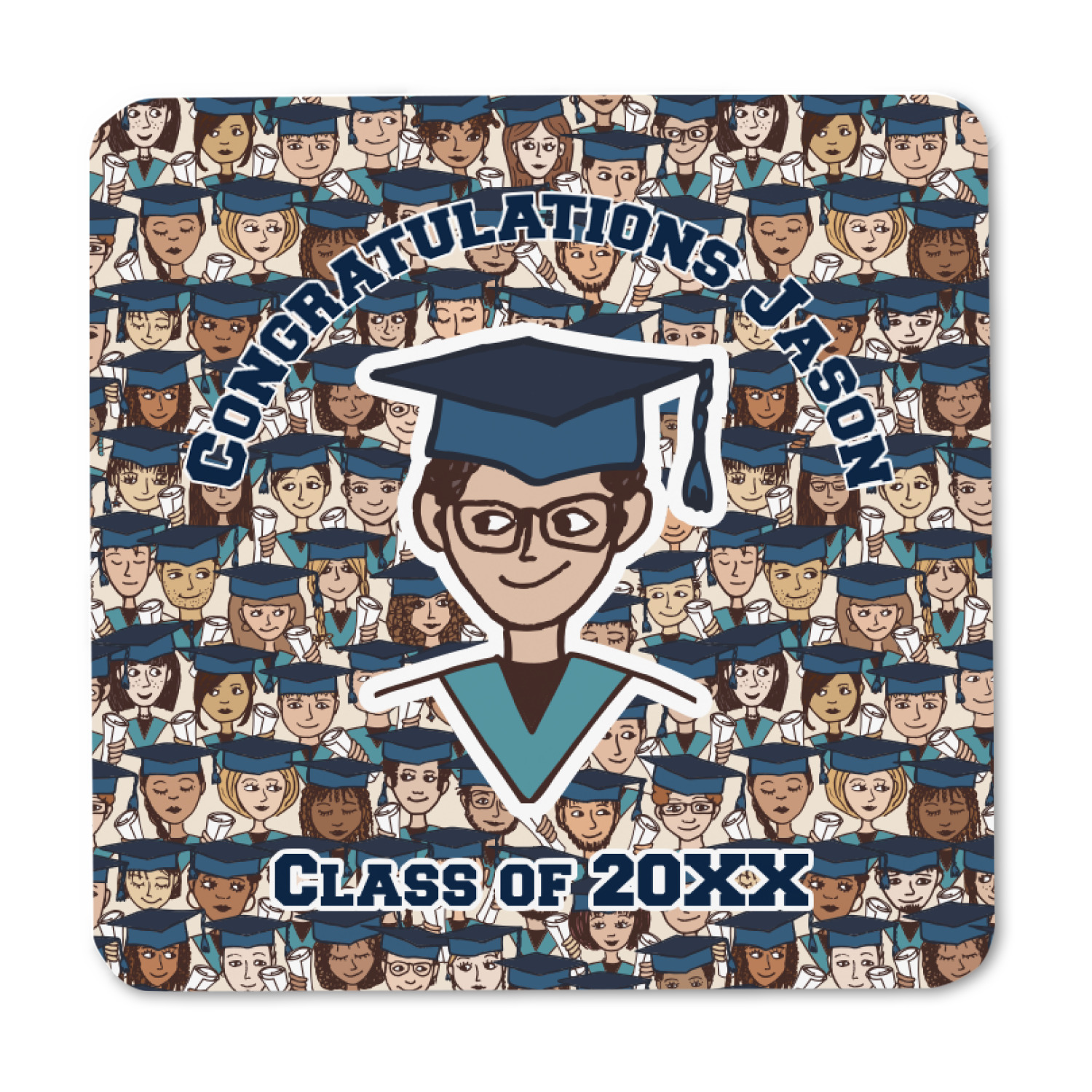 This graduation design depicts a classroom of graduating students all wearing their caps and gowns and holding a diploma in their hands. You can change the color of the mortarboard caps and the color of the stoles to suit your needs.