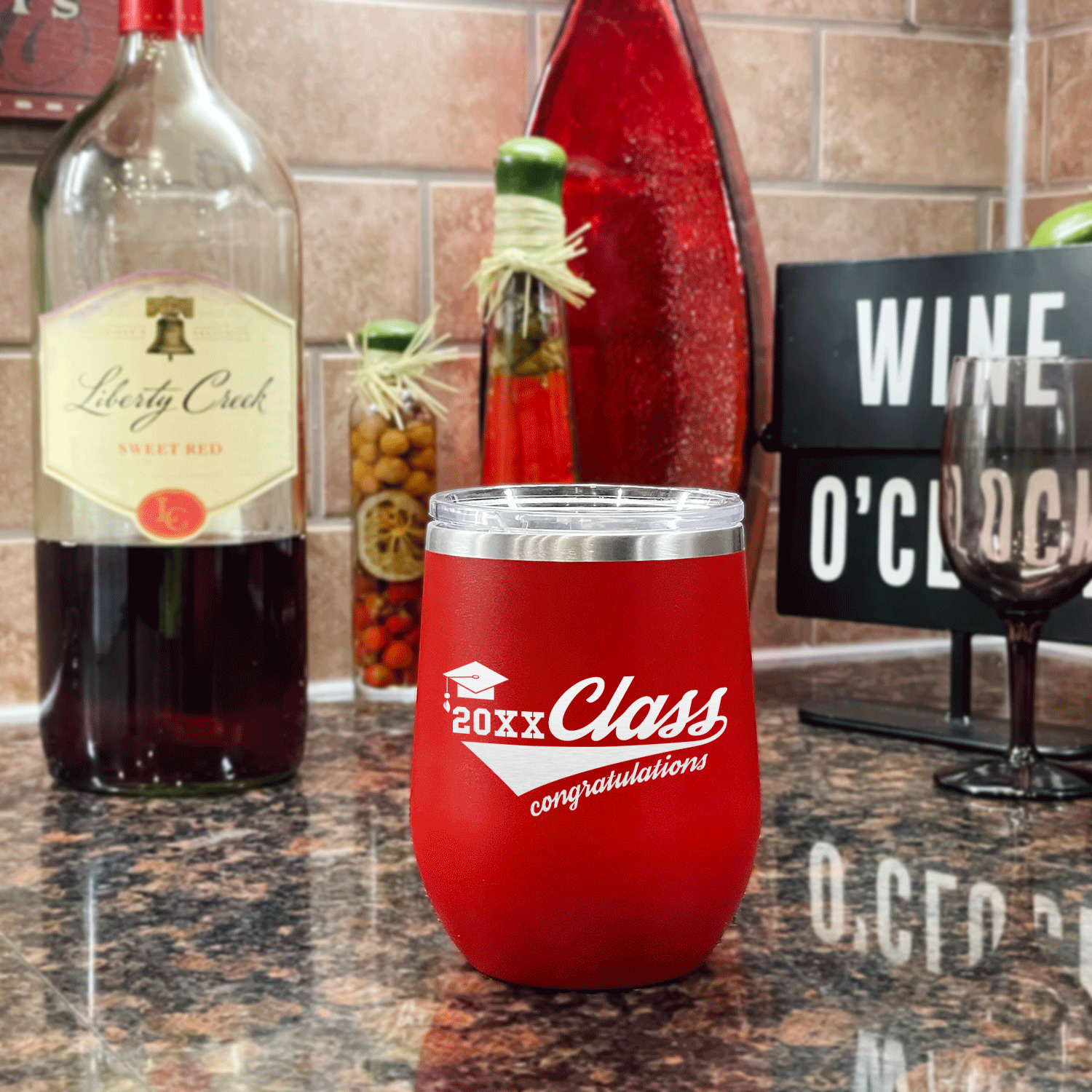Design your wine tumbler with a cool graphic or quote. Even put your initials or monogram! These cups are laser engraved, which looks extra sharp on the metal tumbler.