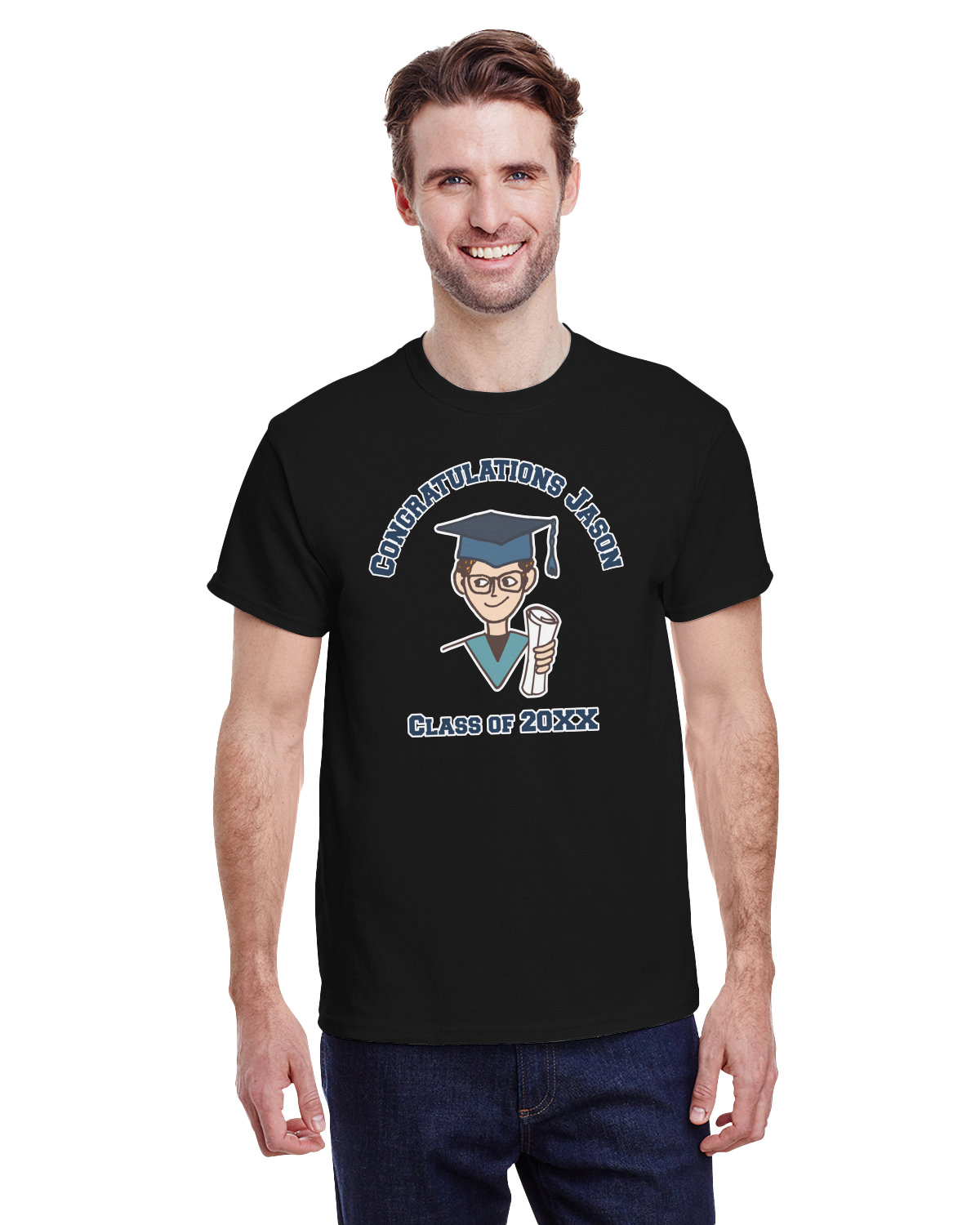For our design, we chose the layout with a single background & a graphic & text personalization style. We chose a boy graduate as our graphic and added congratulations and his class year as the personalization text. We have many of the other graduates from the background in our system, so you can select a graduate that resembles your graduate more closely. You can also customize the graduate more by changing the graduate's skin, hair & stole colors.