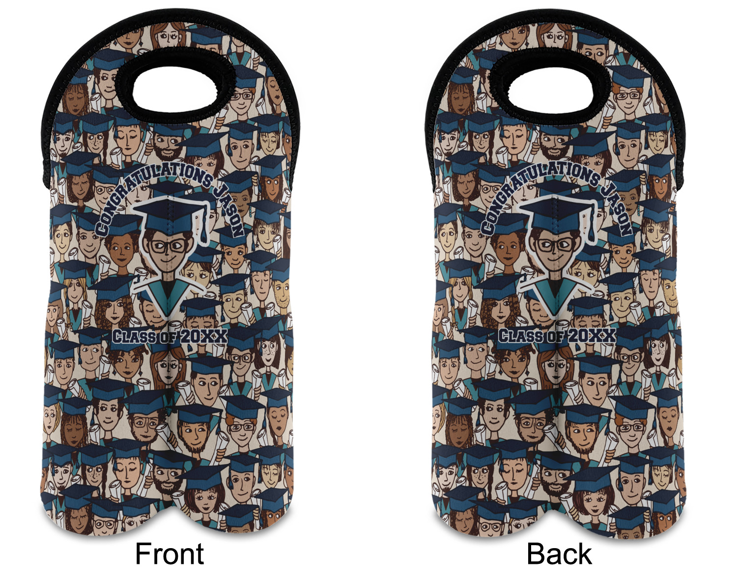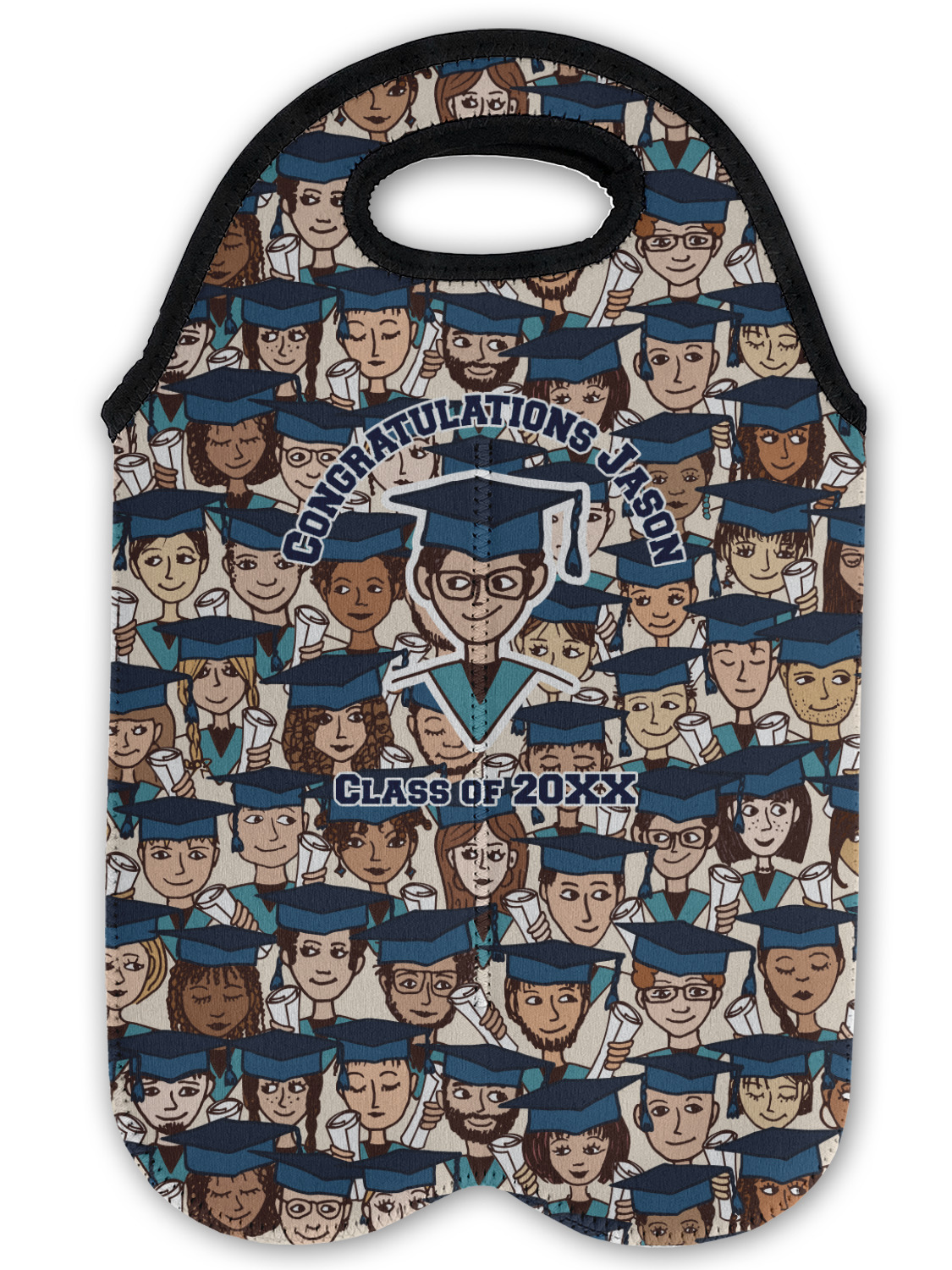 This graduation design depicts a classroom of graduating students all wearing their caps and gowns and holding a diploma in their hands. You can change the color of the mortarboard caps and the color of the stoles to suit your needs.