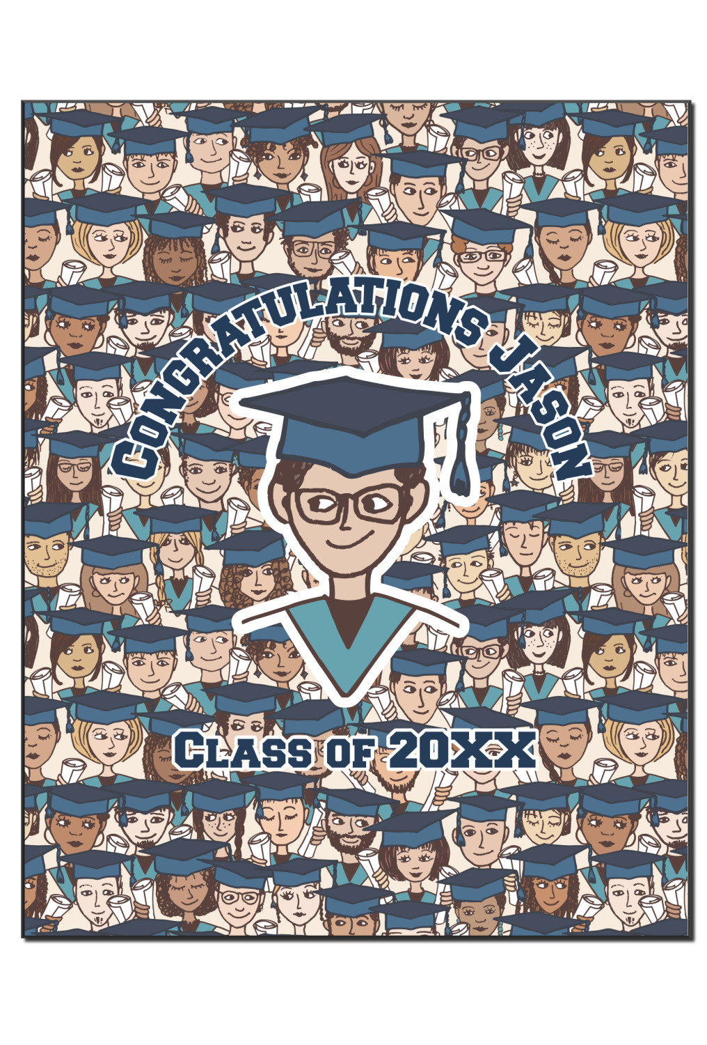 For our design, we chose the layout with a single background & a graphic & text personalization style. We chose a boy graduate as our graphic and added congratulations and his class year as the personalization text. We have many of the other graduates from the background in our system, so you can select a graduate that resembles your graduate more closely. You can also customize the graduate more by changing the graduate's skin, hair & stole colors.