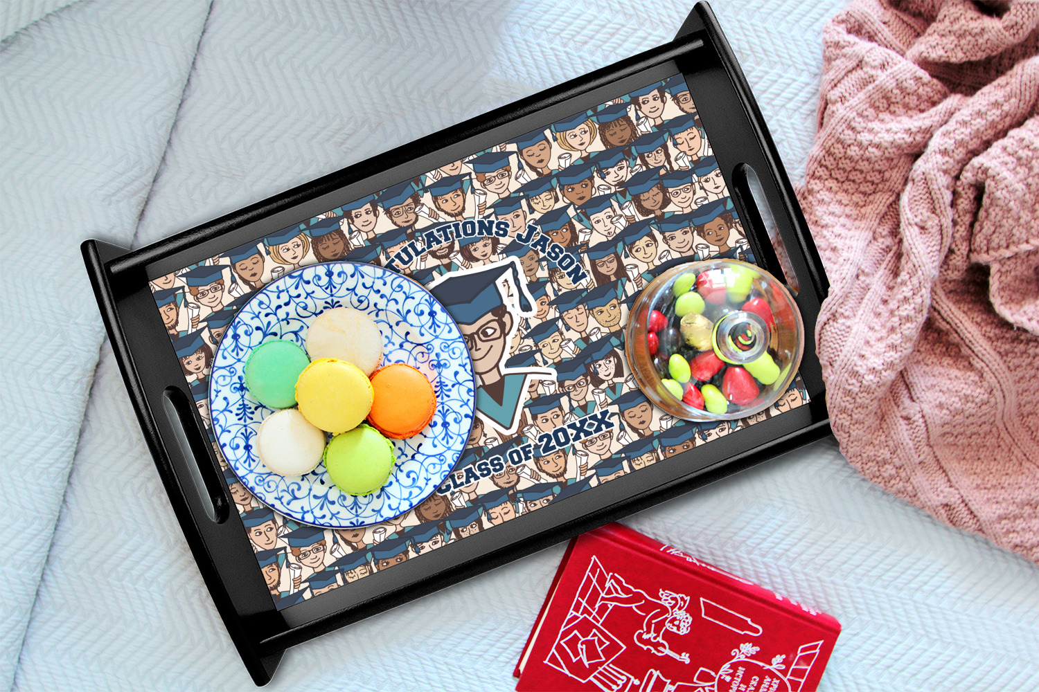 For our design, we chose the layout with a single background & a graphic & text personalization style. We chose a boy graduate as our graphic and added congratulations and his class year as the personalization text. We have many of the other graduates from the background in our system, so you can select a graduate that resembles your graduate more closely. You can also customize the graduate more by changing the graduate's skin, hair & stole colors.