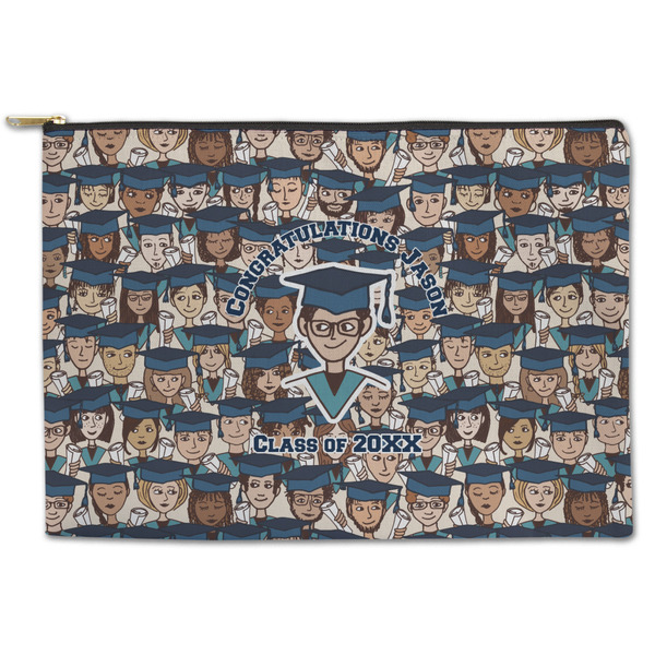 Our zippered pouches are available in two sizes - small: approx 8.5W"x6H and large: approx 12.5Wx8.5H. The pouches are made from a soft & durable canvas fabric that is printed on the outside with your design; the inside has a fused black lining. The printed canvas fabric is then cut and the pouches are sewn right here in the USA. The zipper itself is gold in color and has a round hook.