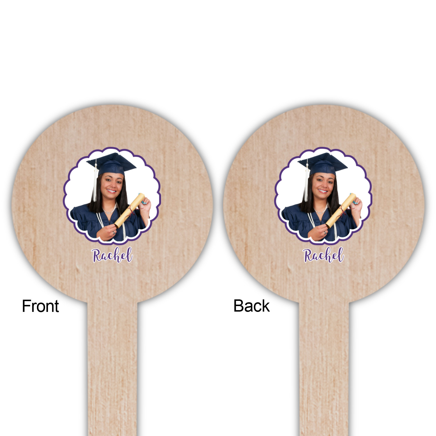 For our design, we chose a mortar cap background in violet. We then layered it with a heart ribbon and a photo / text personalization style. We chose the scalloped label for our female graduate and added her name. There are many other graduate patterns in our system including patterns for math, science, physics etc., so you can easily customize it for you graduate. We also have more masculine ribbons & labels for you male graduate!