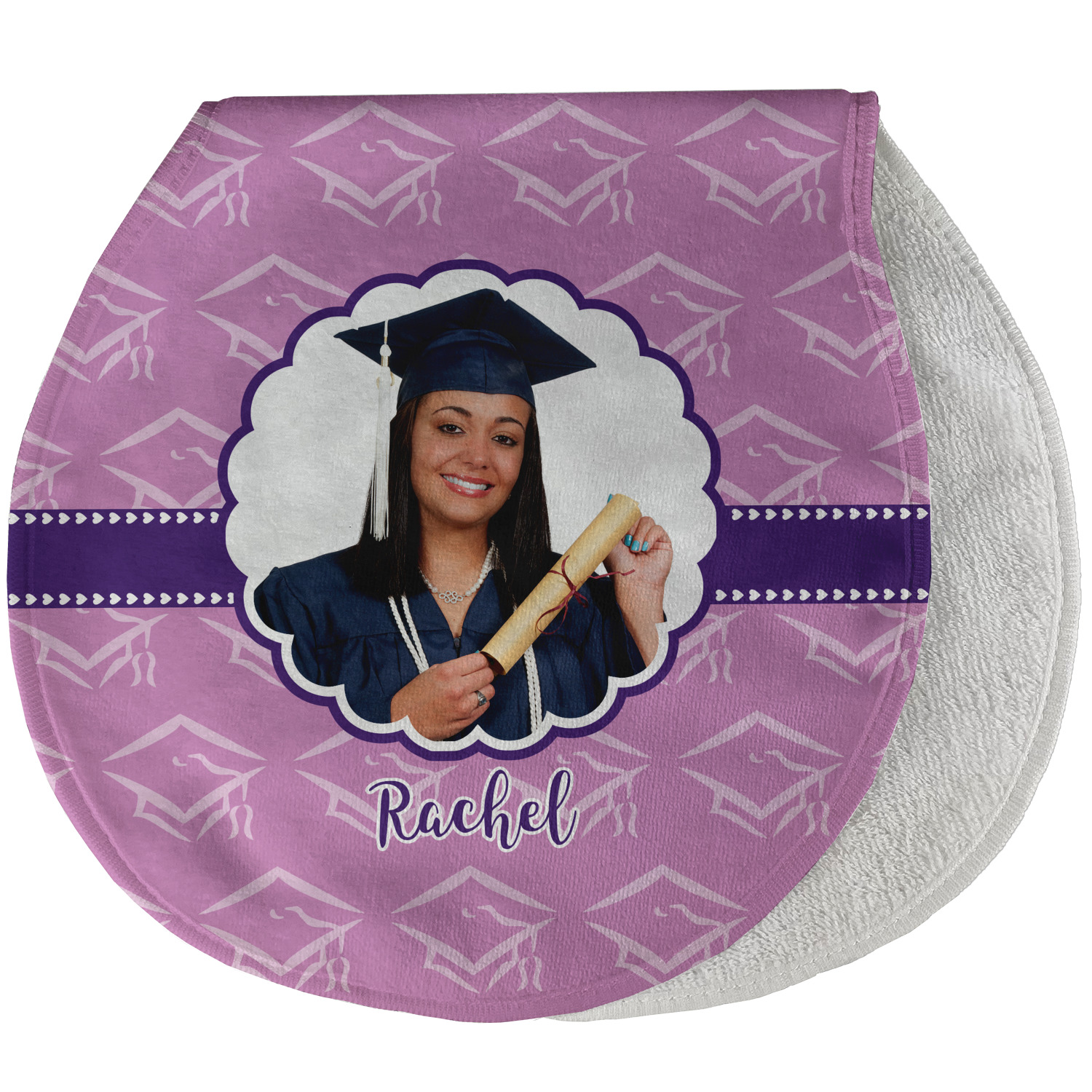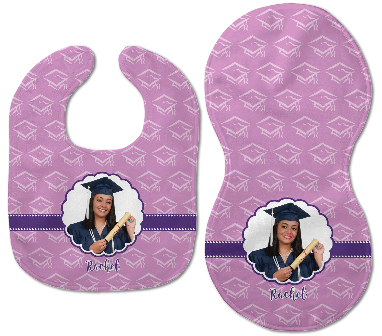 Both our baby bib and burp pad are made up of soft, microfiber velour with a cotton backing. The comfortable and plush material of our bib and burp set is perfect for both baby and parent. We print your design on the microfiber velour face fabric with baby safe ink on your customizable bib and burp cloth to ensure safety for the little one! Our drool bib also comes with a Velcro clasp for safe and easy wear while the burp cloth is a unique peanut shape that perfectly hugs over the shoulder.