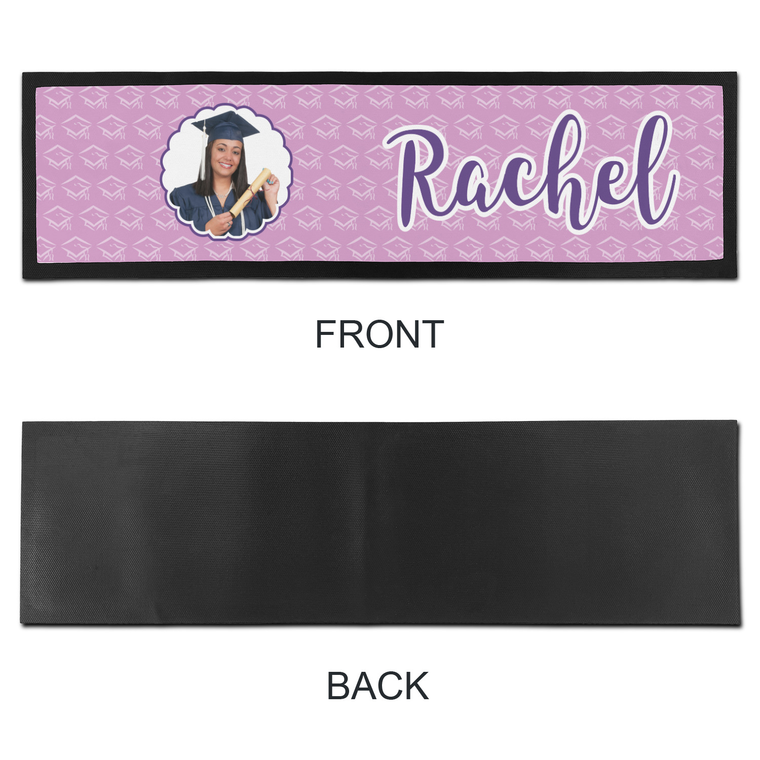 For our design, we chose a mortar cap background in violet. We then layered it with a heart ribbon and a photo / text personalization style. We chose the scalloped label for our female graduate and added her name. There are many other graduate patterns in our system including patterns for math, science, physics etc., so you can easily customize it for you graduate. We also have more masculine ribbons & labels for you male graduate!