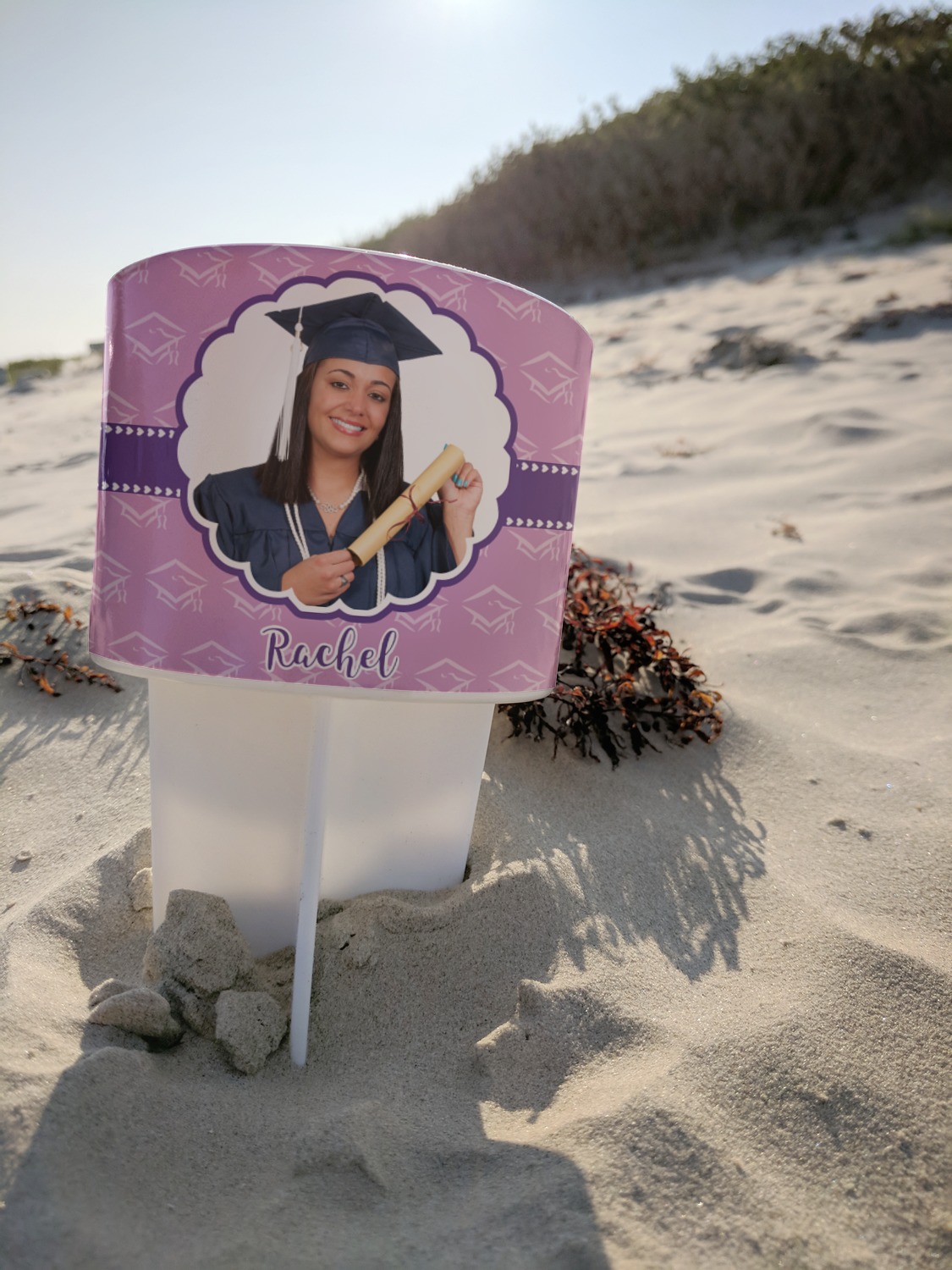 This cup holder has a large stake at its bottom that anchors it to the sand or ground below, while the cup holder rests above the stake. The entire drink holder is made of durable plastic and displays your customization around the cup holder portion. We sell these personalized beach spikers in two different colors: black and white.