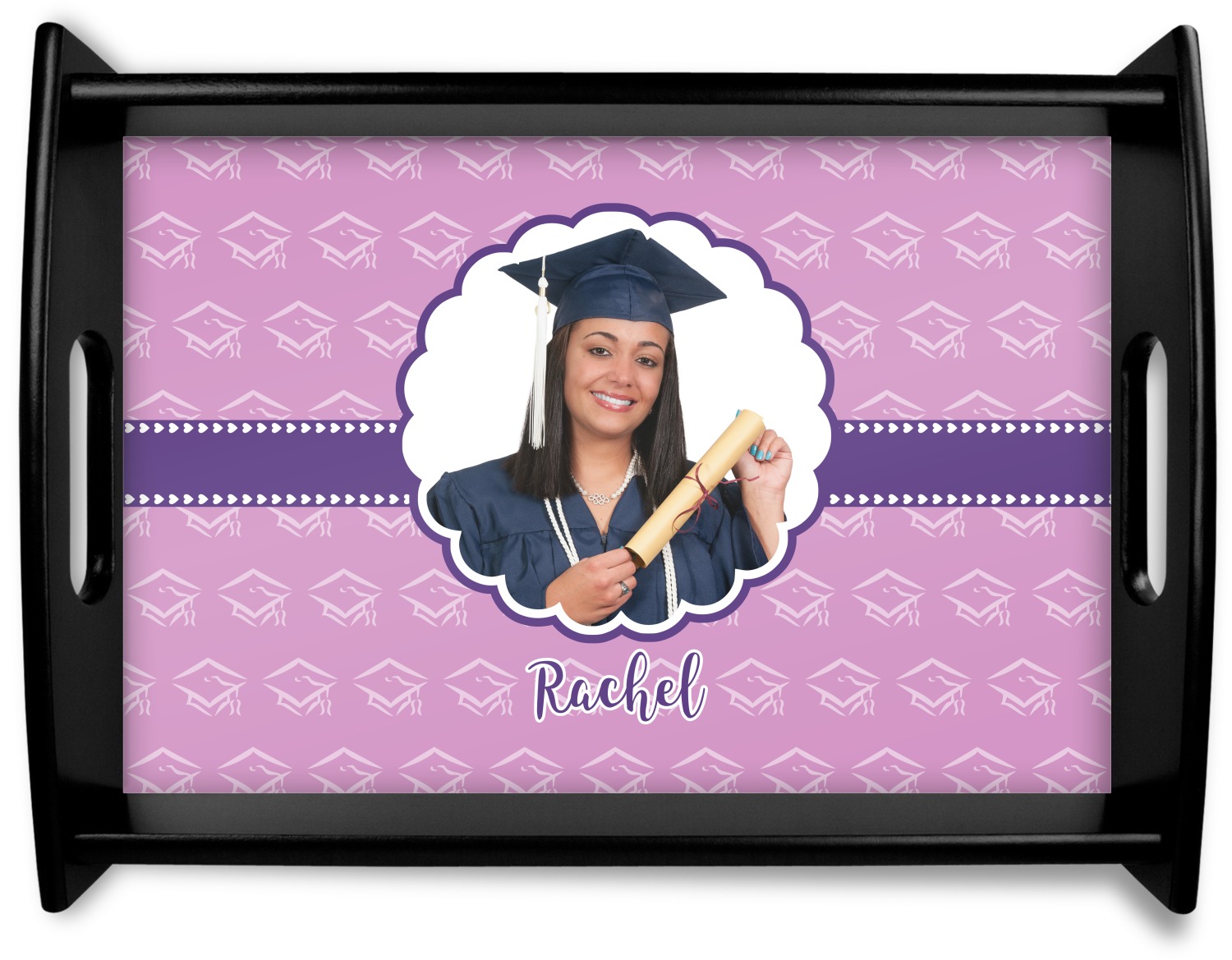 This serving tray with handles features square edges and two rounded sides, creating a very modern look. Each side is fabricated from a beautifully cut, natural wood. The bottom of the interior of the tray displays your customized design in bright, vibrant color. The tray is sold in both a black color and a natural wood look. Each variation of the wood serving tray has two sizes: Small, which is 14" x 10" x 2.25", and Large, which is 19.5" x 13.5" x 2.75".