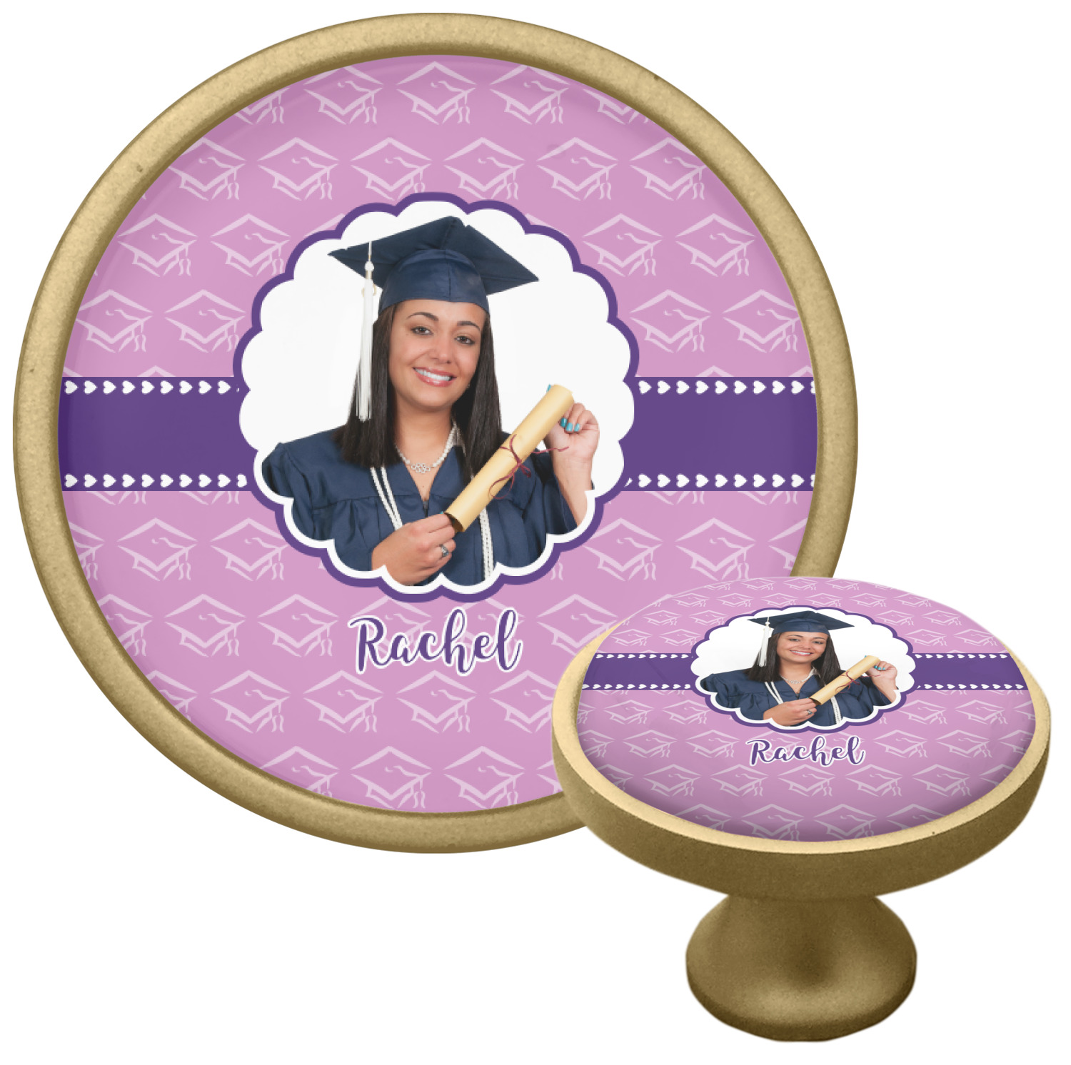 For our design, we chose a mortar cap background in violet. We then layered it with a heart ribbon and a photo / text personalization style. We chose the scalloped label for our female graduate and added her name. There are many other graduate patterns in our system including patterns for math, science, physics etc., so you can easily customize it for you graduate. We also have more masculine ribbons & labels for you male graduate!