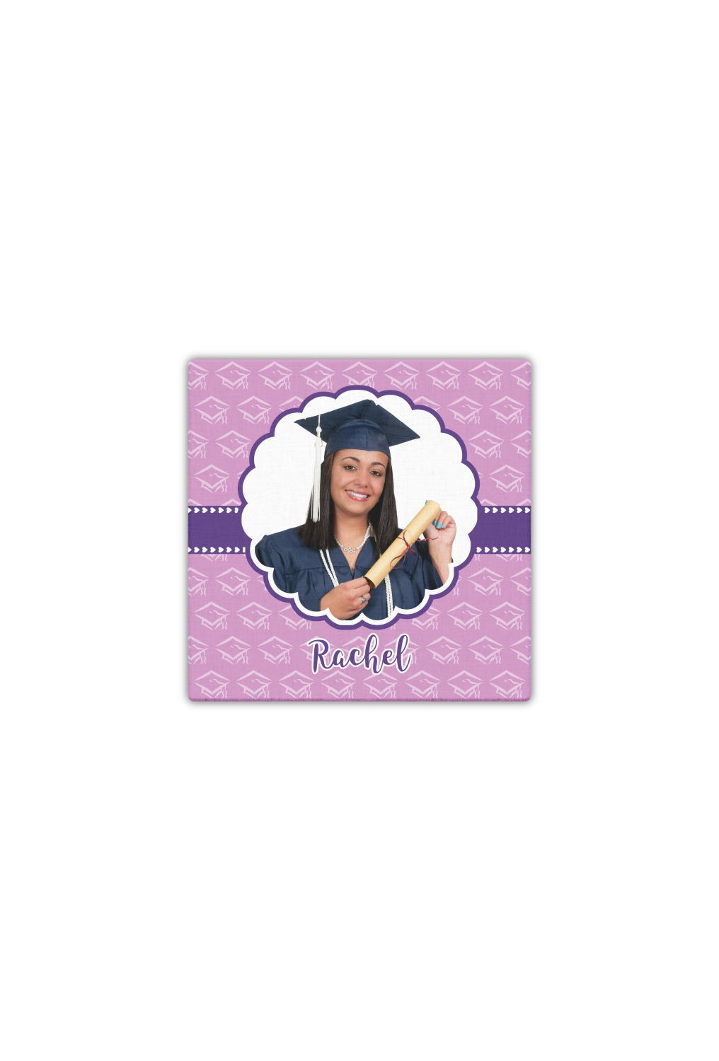 For our design, we chose a mortar cap background in violet. We then layered it with a heart ribbon and a photo / text personalization style. We chose the scalloped label for our female graduate and added her name. There are many other graduate patterns in our system including patterns for math, science, physics etc., so you can easily customize it for you graduate. We also have more masculine ribbons & labels for you male graduate!