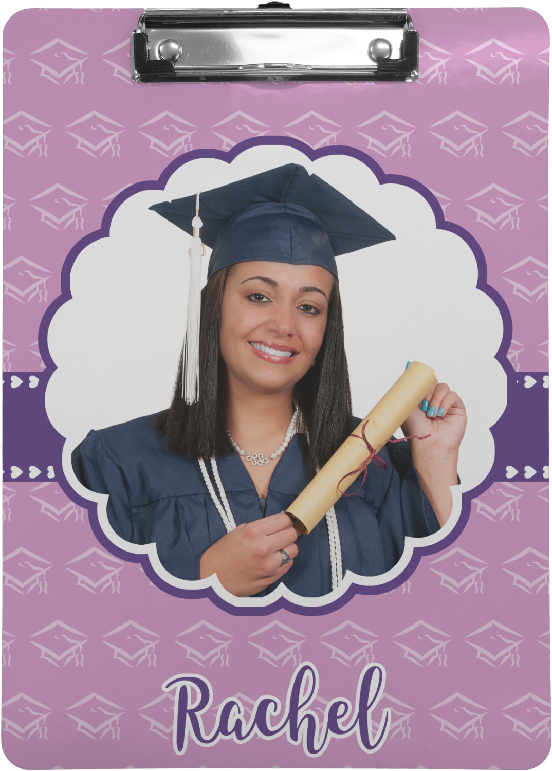 For our design, we chose a mortar cap background in violet. We then layered it with a heart ribbon and a photo / text personalization style. We chose the scalloped label for our female graduate and added her name. There are many other graduate patterns in our system including patterns for math, science, physics etc., so you can easily customize it for you graduate. We also have more masculine ribbons & labels for you male graduate!