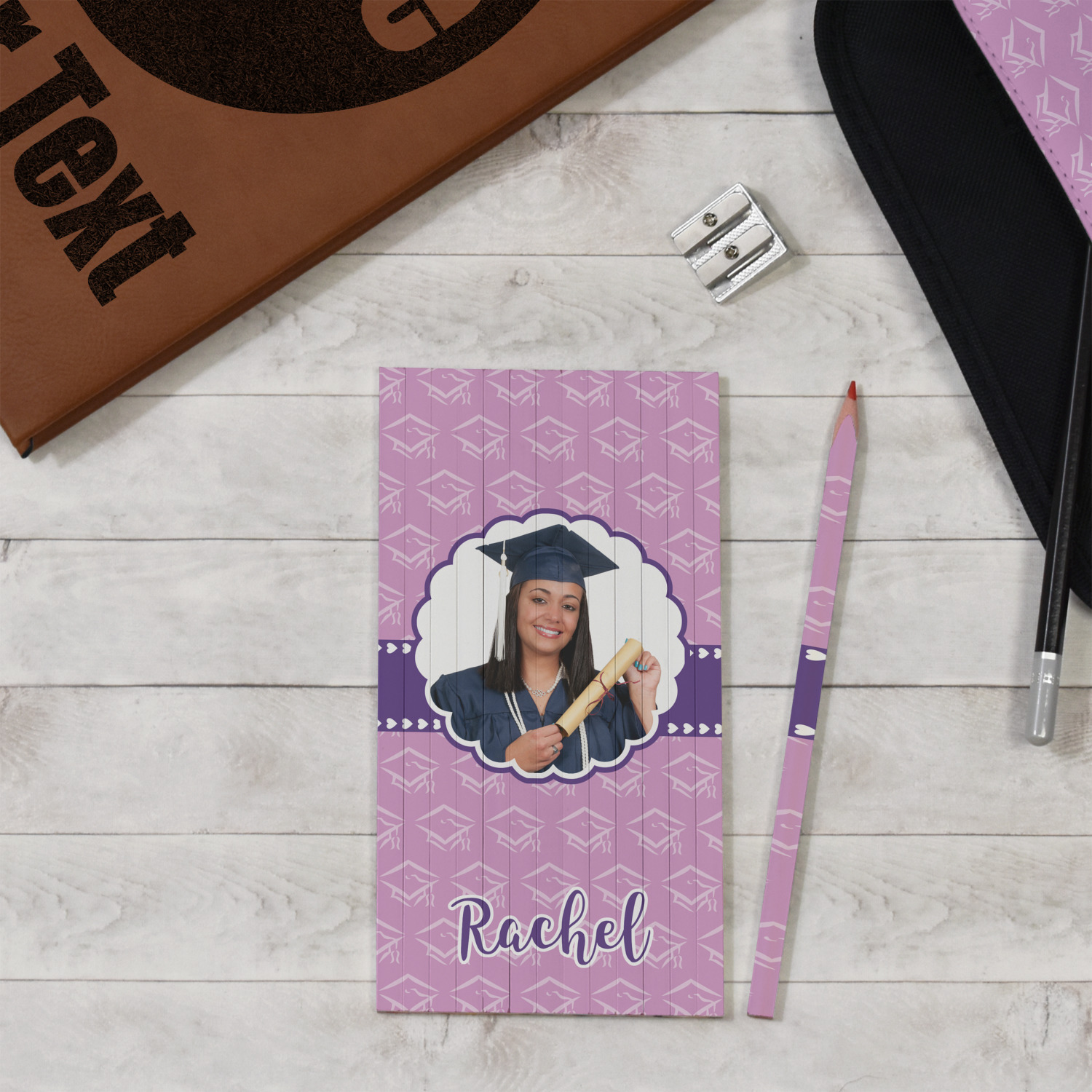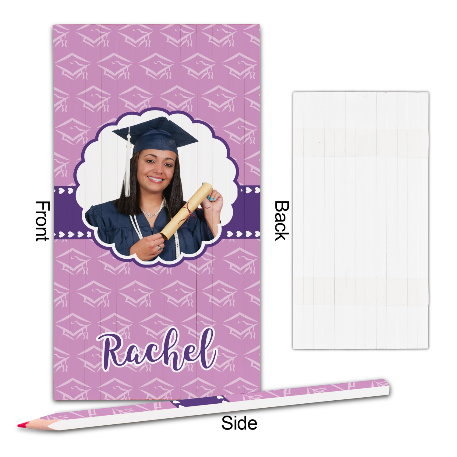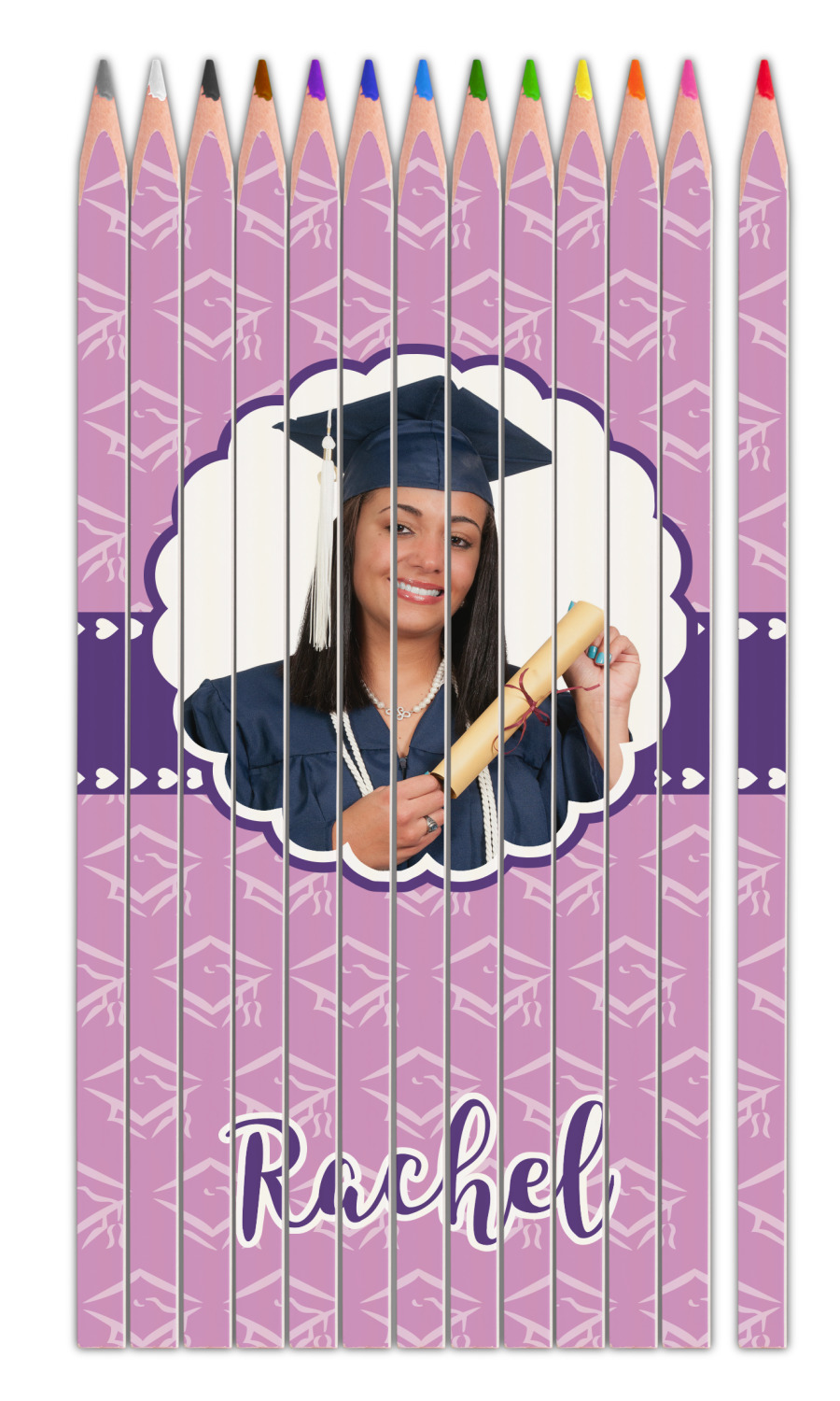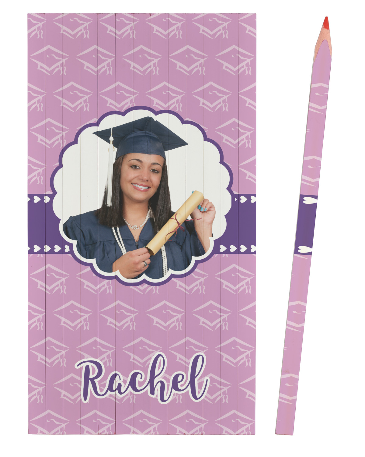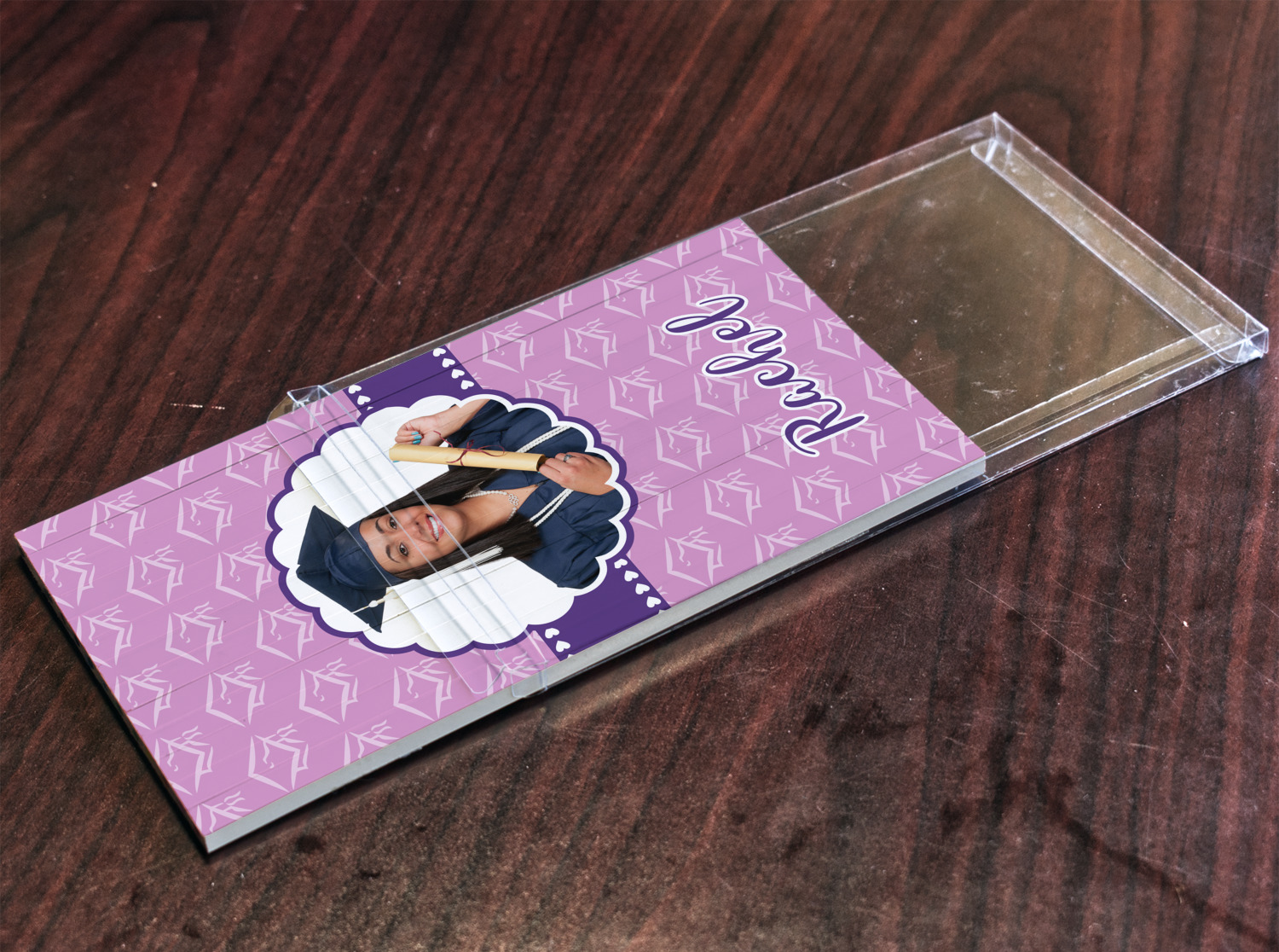 For our design, we chose a mortar cap background in violet. We then layered it with a heart ribbon and a photo / text personalization style. We chose the scalloped label for our female graduate and added her name. There are many other graduate patterns in our system including patterns for math, science, physics etc., so you can easily customize it for you graduate. We also have more masculine ribbons & labels for you male graduate!