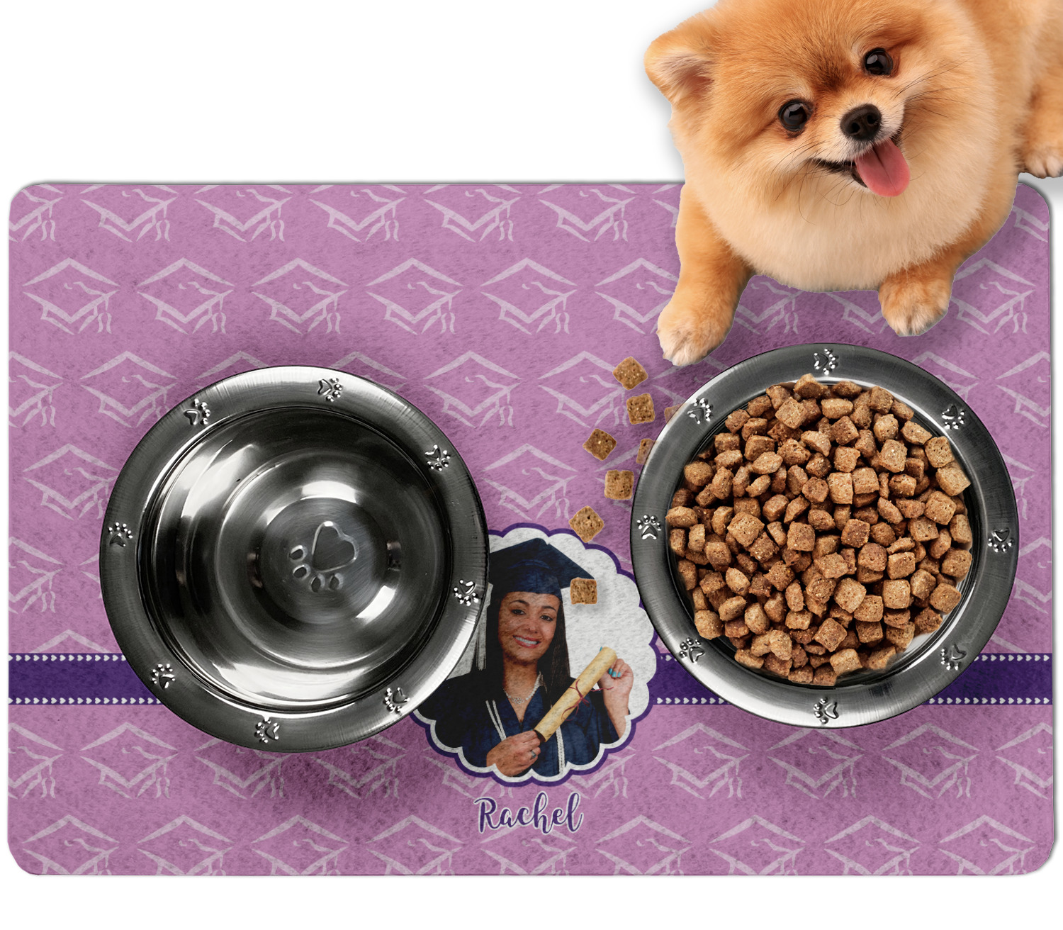 This dog bowl mat, fabricated from polyester, proudly displays your customized design on its top, while its bottom includes a non-slip rubber. This feature allows it to remain firmly in place, even when your dog spills his/her water. With 3 sizes available (18" x 12", 24" x 18", 30" x 24"), the pet food mat has ample space for both a food and water bowl for any sized dogs. Though specified for dogs' use, these mats are also a splendid option for cats.