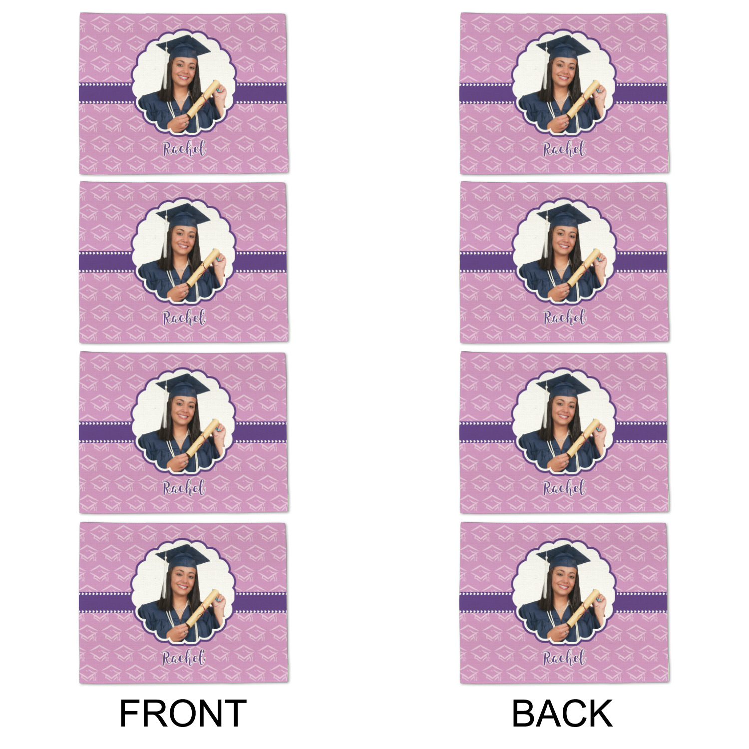 For our design, we chose a mortar cap background in violet. We then layered it with a heart ribbon and a photo / text personalization style. We chose the scalloped label for our female graduate and added her name. There are many other graduate patterns in our system including patterns for math, science, physics etc., so you can easily customize it for you graduate. We also have more masculine ribbons & labels for you male graduate!