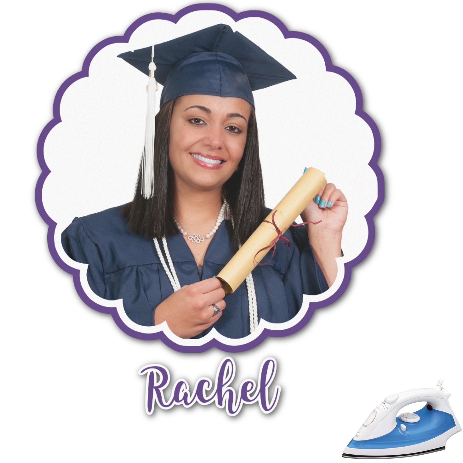 For our design, we chose a mortar cap background in violet. We then layered it with a heart ribbon and a photo / text personalization style. We chose the scalloped label for our female graduate and added her name. There are many other graduate patterns in our system including patterns for math, science, physics etc., so you can easily customize it for you graduate. We also have more masculine ribbons & labels for you male graduate!