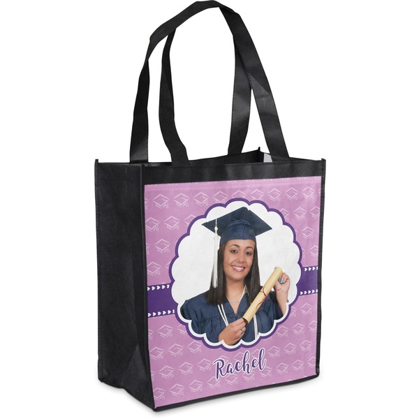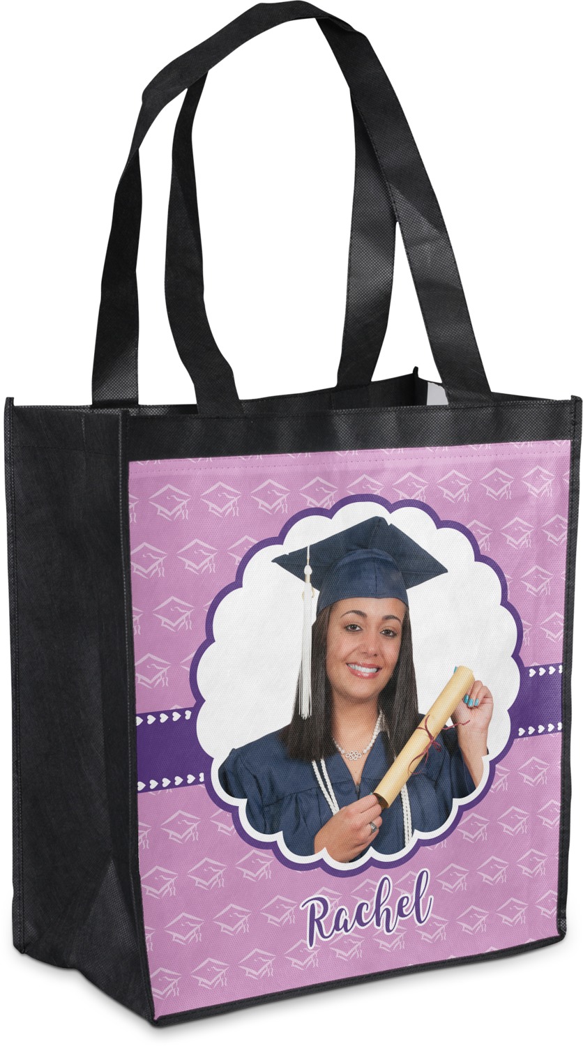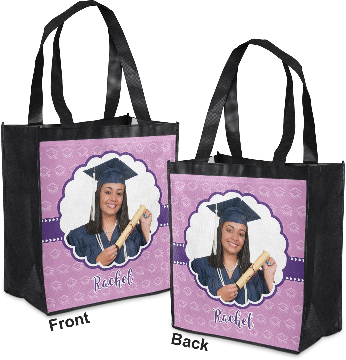 Made from a durable, biodegradable material, these reusable shopping bags can support up to 30 pounds of weight. With two large handles, measuring at 8.5 inches each, these personalized tote bags are easy to carry to your vehicle or home. The bag itself is 12 by 13.5 inches, and can expand to a depth of 7 inches. Your customization is printed on both the front and back, while the remaining sides, trim, and handle are a sleek, charcoal black.