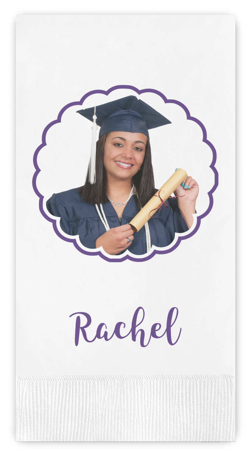 For our design, we chose a mortar cap background in violet. We then layered it with a heart ribbon and a photo / text personalization style. We chose the scalloped label for our female graduate and added her name. There are many other graduate patterns in our system including patterns for math, science, physics etc., so you can easily customize it for you graduate. We also have more masculine ribbons & labels for you male graduate!