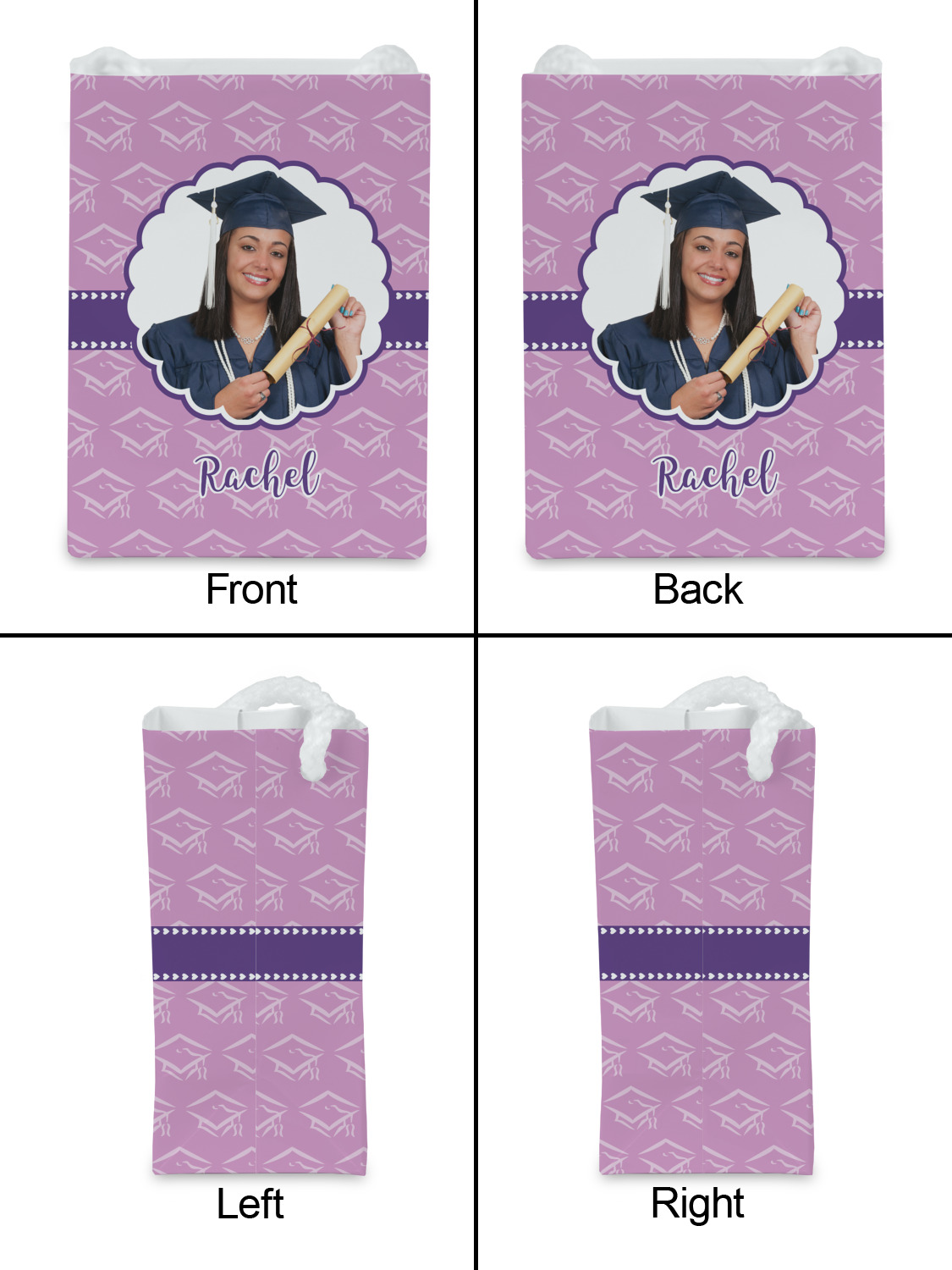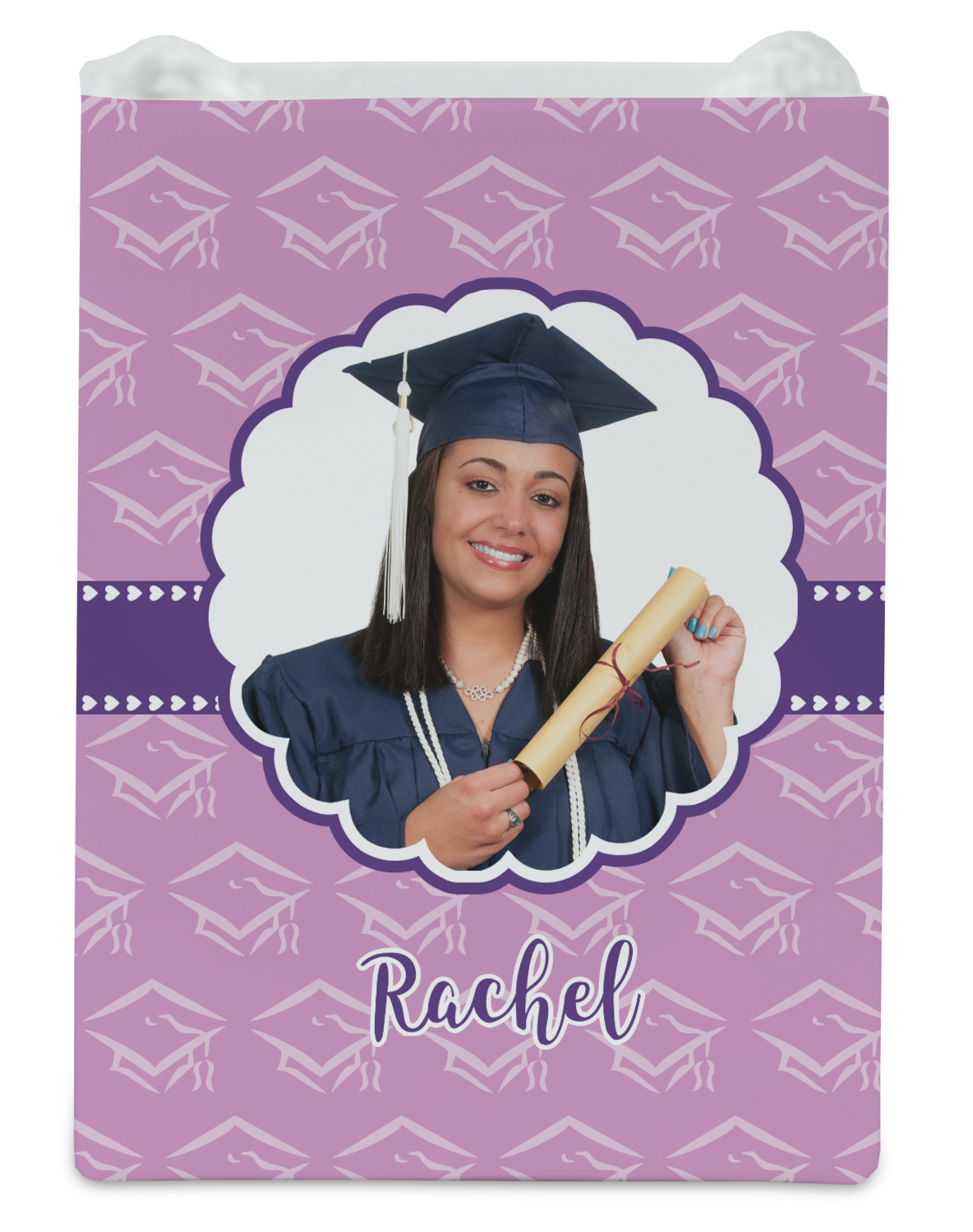 For our design, we chose a mortar cap background in violet. We then layered it with a heart ribbon and a photo / text personalization style. We chose the scalloped label for our female graduate and added her name. There are many other graduate patterns in our system including patterns for math, science, physics etc., so you can easily customize it for you graduate. We also have more masculine ribbons & labels for you male graduate!