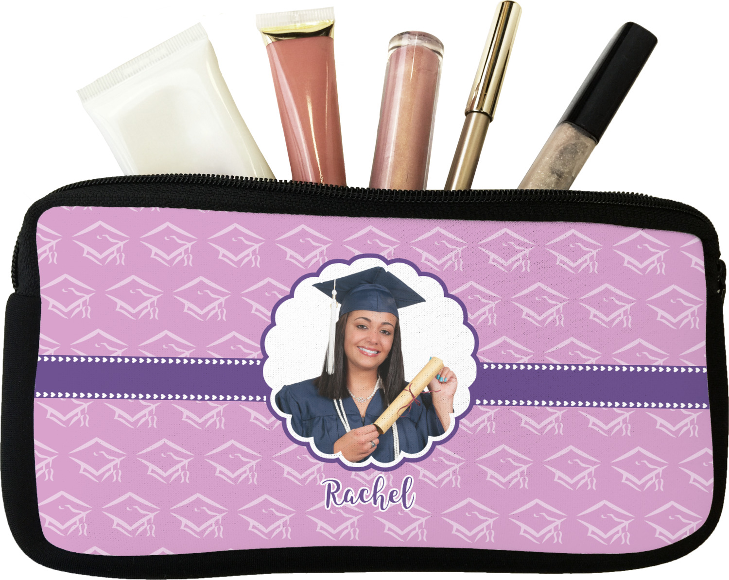 Our personalized makeup bags are available in many different designs, patterns and colors - so you are sure to find one that will love. They are made of neoprene (same material as wet-suits) and thus are water resistant, so spillages in your makeup bag will not end up all over you purse. They are customized on one side and are black on the other side and the zipper is black as well.