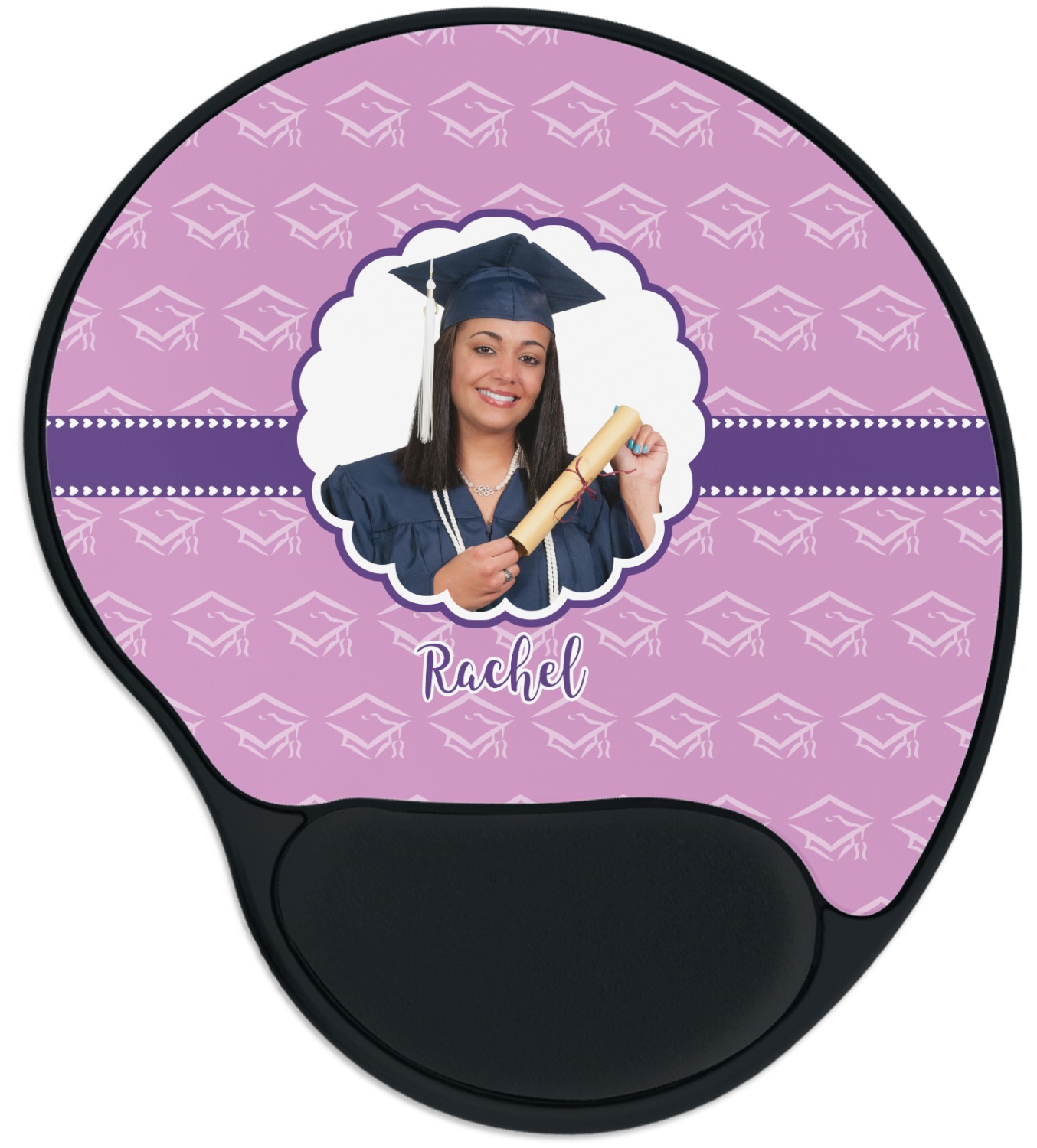 The top of these personalized mouse pads are made from a polyester, while the underside is plastic. The back of these mouse mats include rubber feet to prevent any slippage while in use. A padded wrist support, made from plush memory foam, occupies the bottom section of these computer mouse pads. Your customized design is printed onto the face of this mat, with the remaining sides and support piece colored in black. The mat itself is rounded and measures at 10.25" x 9.13".