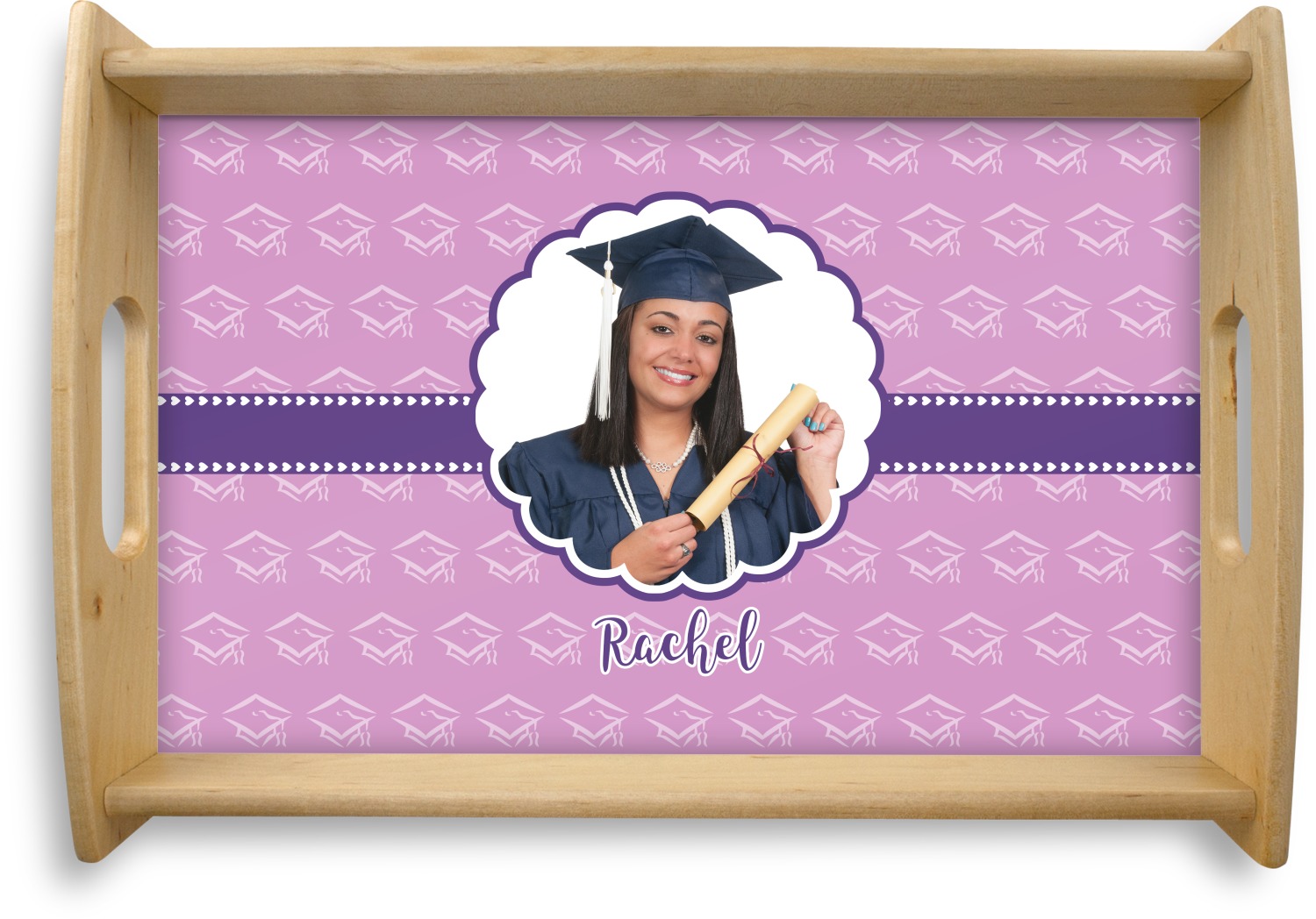 This serving tray with handles features square edges and two rounded sides, creating a very modern look. Each side is fabricated from a beautifully cut, natural wood. The bottom of the interior of the tray displays your customized design in bright, vibrant color. The tray is sold in both a black color and a natural wood look. Each variation of the wood serving tray has two sizes: Small, which is 14" x 10" x 2.25", and Large, which is 19.5" x 13.5" x 2.75".