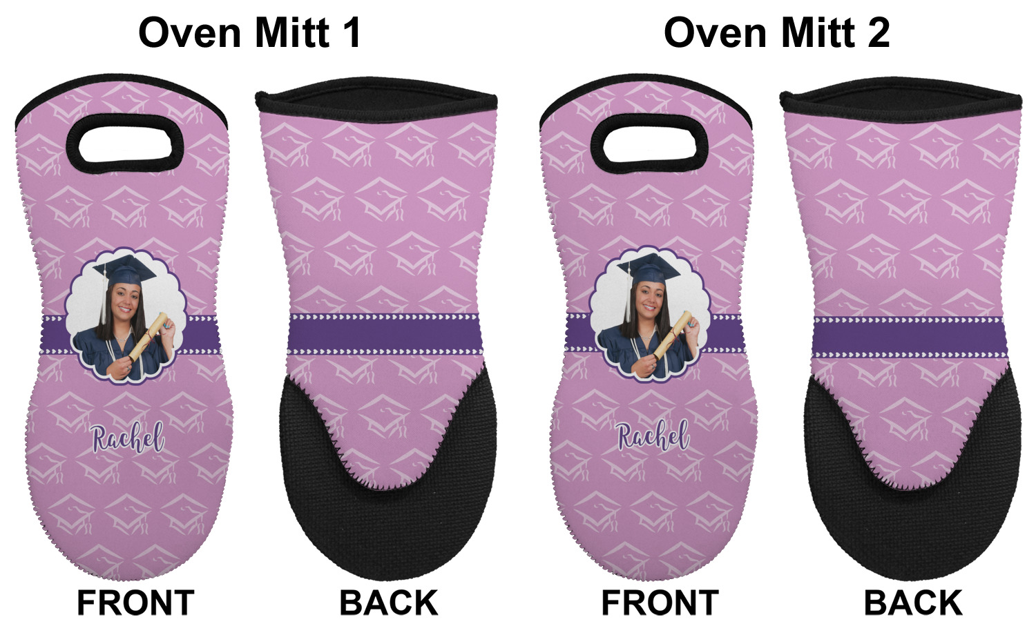 These heat resistant gloves are made entirely of a durable neoprene; the front features a softer texture, while the palm's side has a textured surface, meant to handle heat up to 500 degrees Fahrenheit. Thick, heavy duty stitching connects the two sides. A small, oval cutout appears on the front, and can be used to hang and store the mitt. Your personalization appears on the front, and the upper part of the back of the mitt. The style of these oven mitts are suitable for both the right and left hand, depending on your needs. If you need one for each hand, be sure to order two!