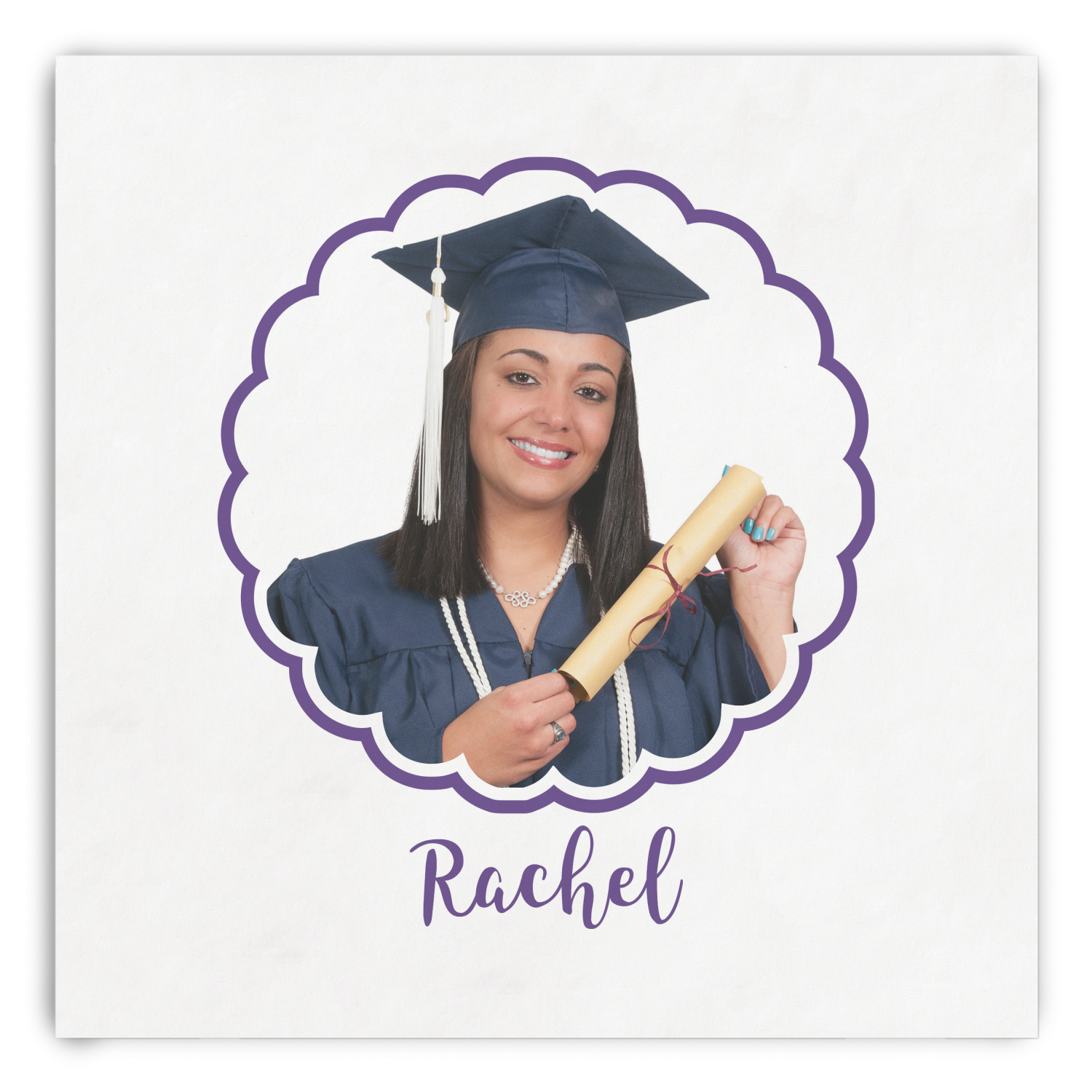For our design, we chose a mortar cap background in violet. We then layered it with a heart ribbon and a photo / text personalization style. We chose the scalloped label for our female graduate and added her name. There are many other graduate patterns in our system including patterns for math, science, physics etc., so you can easily customize it for you graduate. We also have more masculine ribbons & labels for you male graduate!