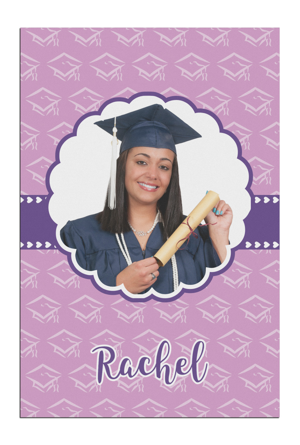 For our design, we chose a mortar cap background in violet. We then layered it with a heart ribbon and a photo / text personalization style. We chose the scalloped label for our female graduate and added her name. There are many other graduate patterns in our system including patterns for math, science, physics etc., so you can easily customize it for you graduate. We also have more masculine ribbons & labels for you male graduate!