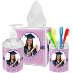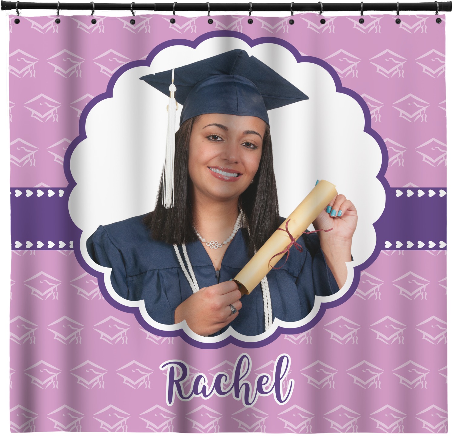 For our design, we chose a mortar cap background in violet. We then layered it with a heart ribbon and a photo / text personalization style. We chose the scalloped label for our female graduate and added her name. There are many other graduate patterns in our system including patterns for math, science, physics etc., so you can easily customize it for you graduate. We also have more masculine ribbons & labels for you male graduate!