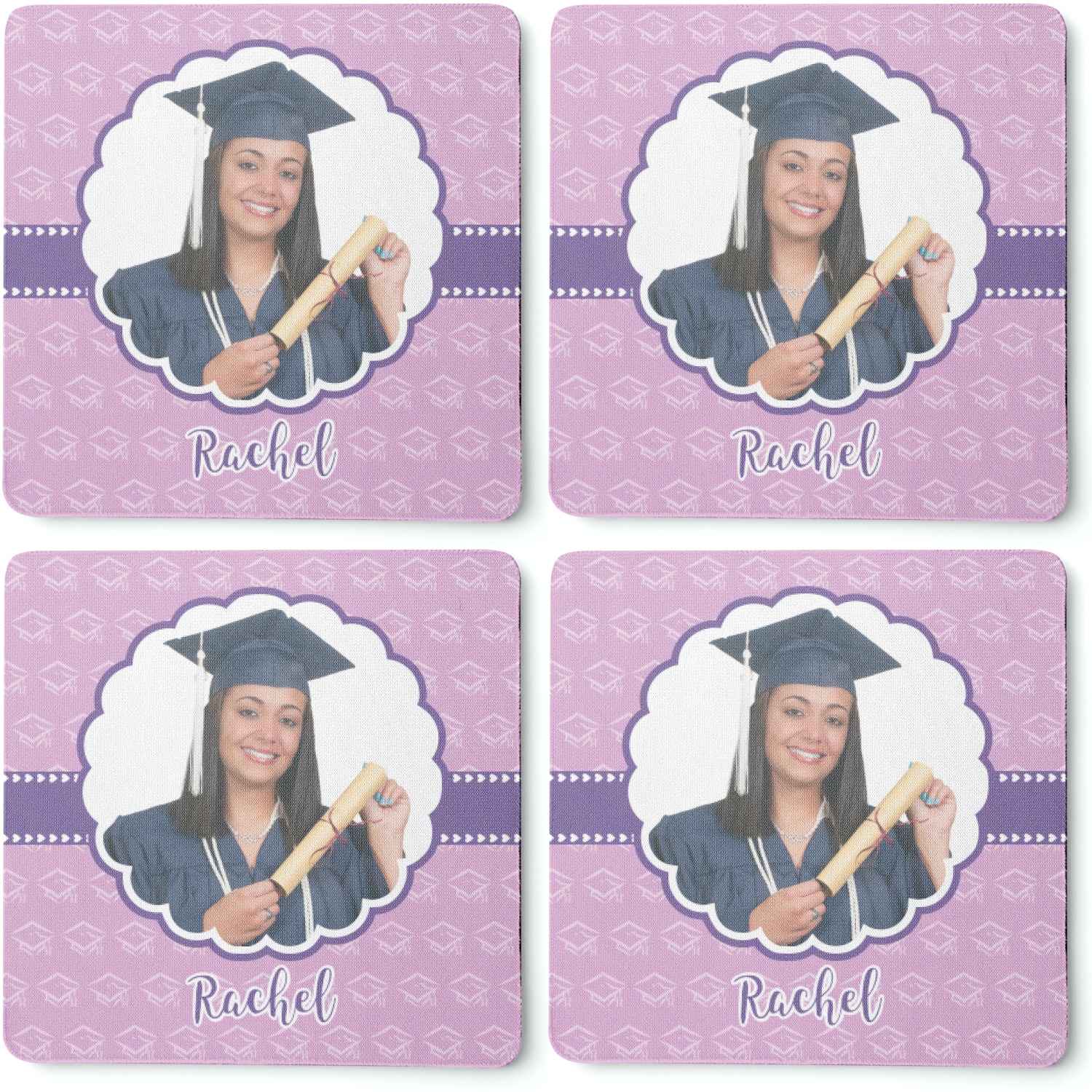 These drink coasters have a smooth, polyester top and a textured, rubber backing on its bottom. The non-slip rubber backing underneath works to keep any spills at bay. At 4 by 4 by 0.25 inches thick, these custom coasters are a suitable size for most drinkware. Your personalization is displayed atop the face of the cup coaster. We sell these rubber coasters in two different shapes: square and round. You can buy each shape as singulars or as a set of 4.